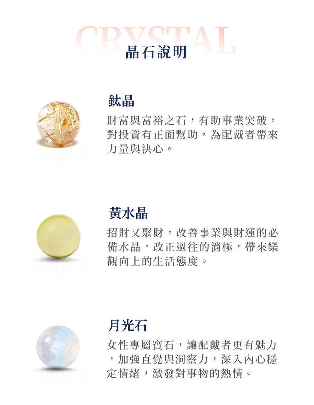 ・鈦晶、黃水晶、月光石、藍紋瑪瑙、白水晶