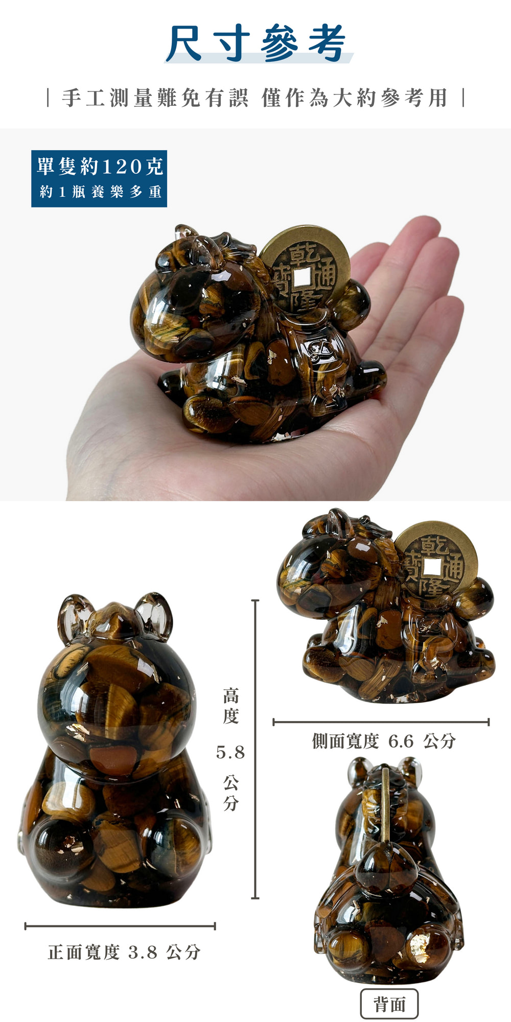 ◿ 成分:水晶滴膠、天然晶石◿ 單隻尺寸:(手工測量會有些許誤差) ▸ 整體高度 5.8 CM▸ 正面寬度 3.8 CM▸ 側面寬度 6.6 CM◿ 單隻重量:約120克(誤差值+-10克)