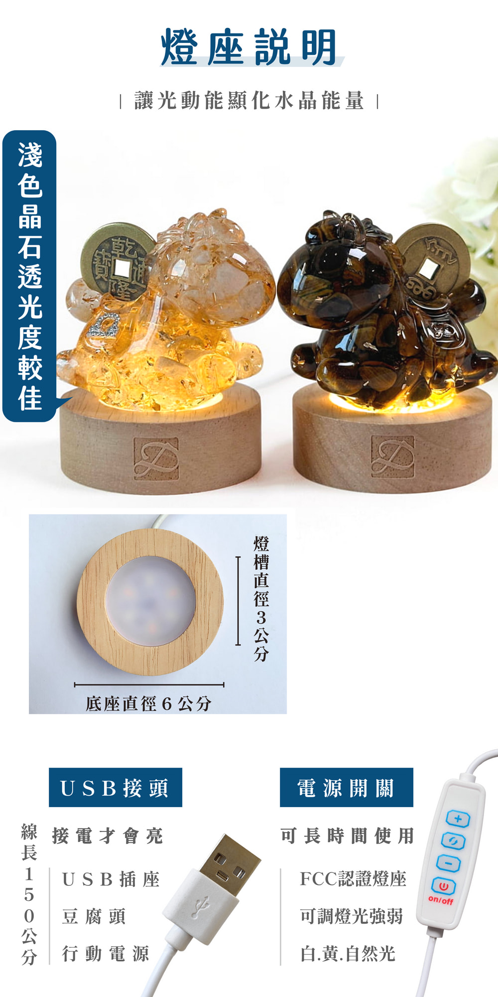 ◿ 尺寸:直徑6CM • 燈槽直徑3CM • 高度2CM◿ 功率:5W及以下◿ 電壓:≤ 36(含)◿ 電流:1A~2A◿ 線長:1.5米USB線