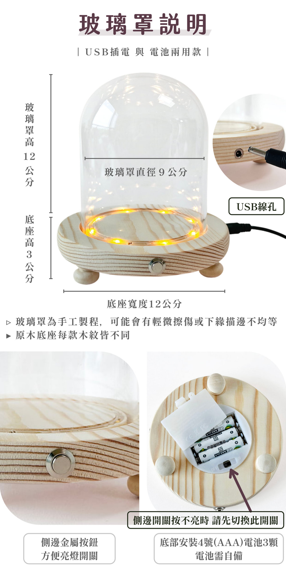 ◿ 成分:高硼硅玻璃上蓋+原木色底座(含腳柱)◿ 玻璃罩尺寸:(手工測量會有些許誤差) ✦ 高度 12CM✦ 直徑 9CM◿ 底座尺寸:✦ 高度 3CM✦ 直徑 12CM◿ 重量:210克(誤差值+-10克)⚠ 底座需裝三個4號(AAA)電池(請自備)或 以內附USB線插電使用