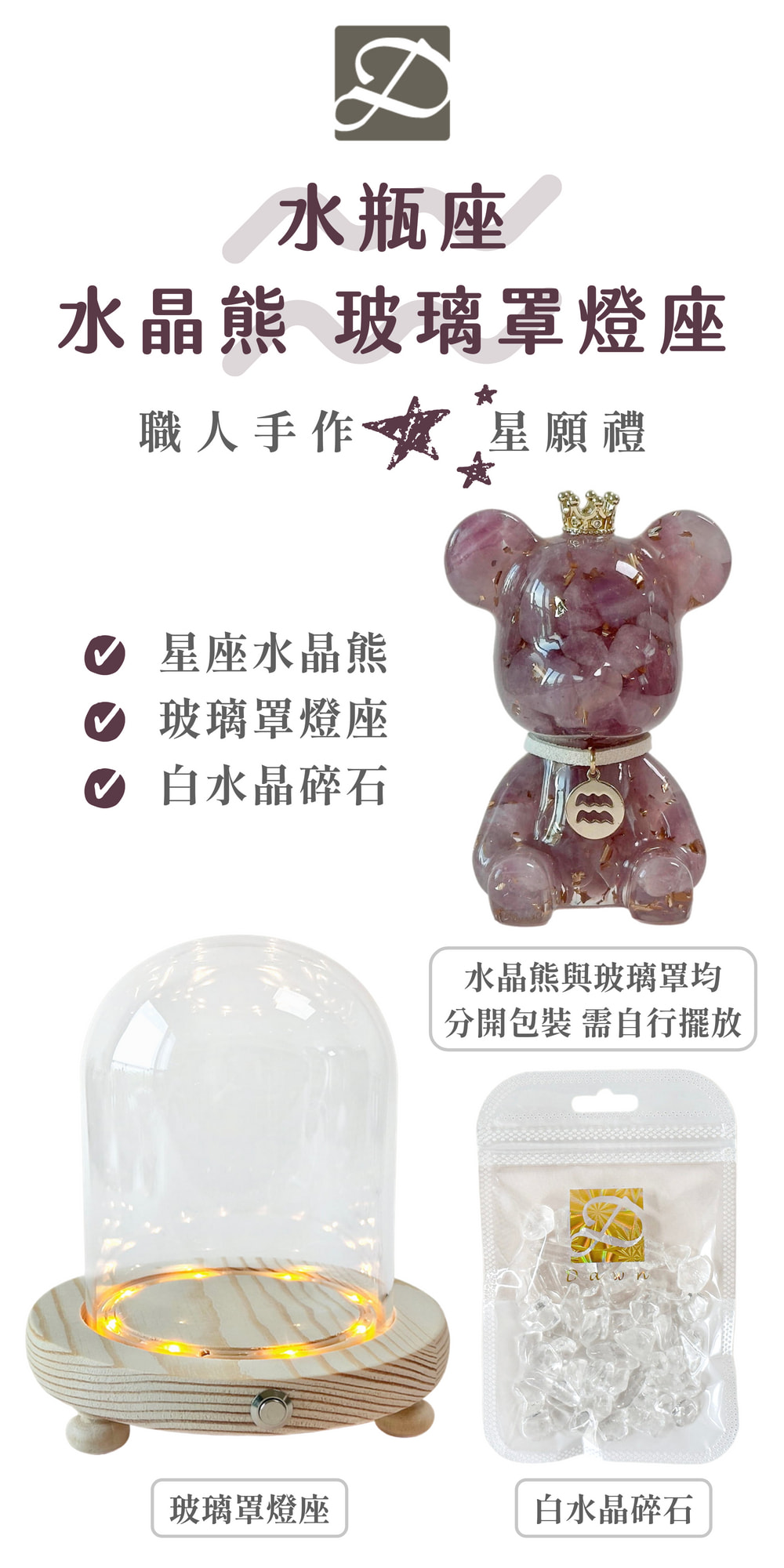 ◿ 商品內容:星座水晶熊1隻+玻璃罩燈座1個+白水晶碎石40克1包