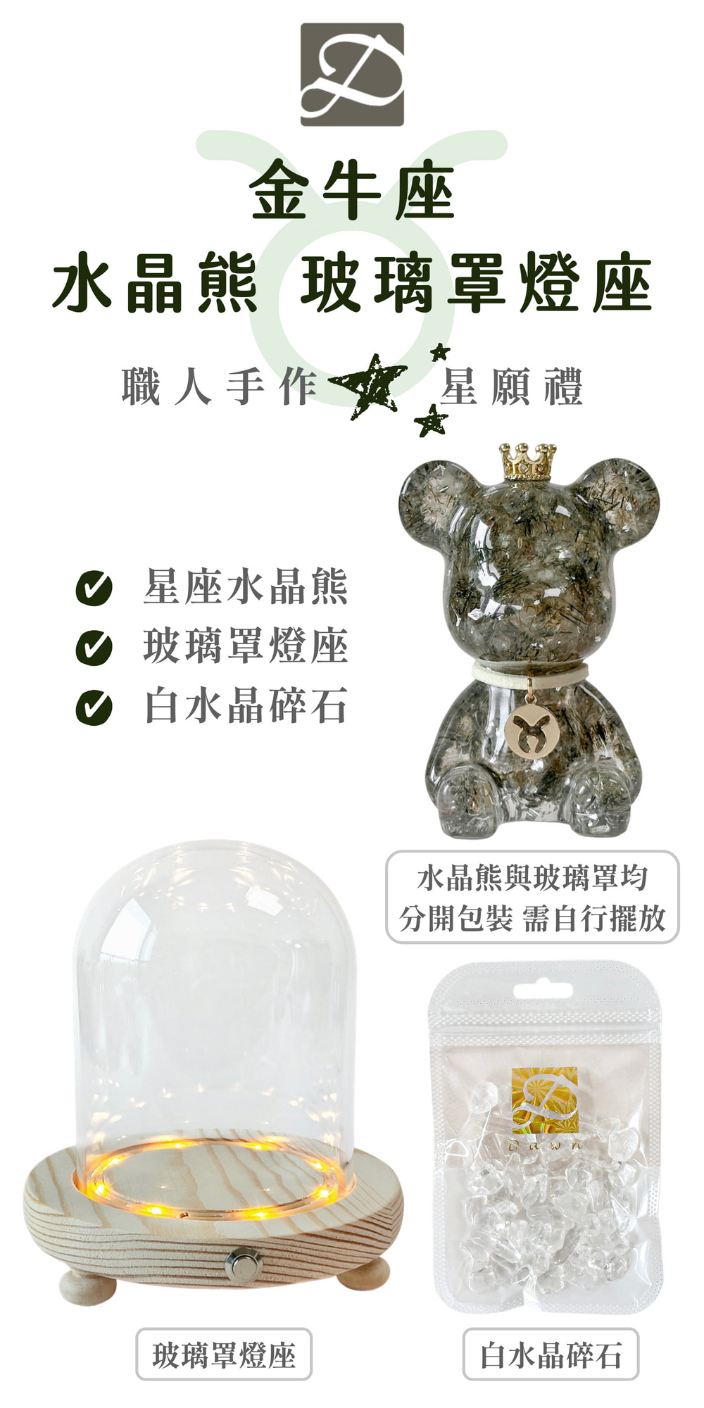 ◿ 商品內容:星座水晶熊1隻+玻璃罩燈座1個+白水晶碎石40克1包