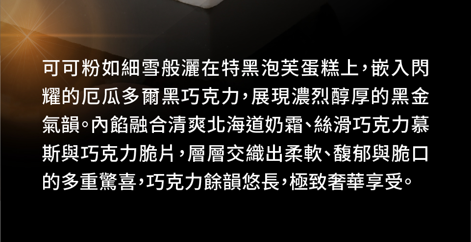 內容物:可可粉/特黑泡芙蛋糕/厄瓜多爾巧克力碎片/北海道奶霜/厄瓜多爾巧克力慕斯葷素:葷規格:1條/盒商品尺寸:18×8.5×6.5公分保存期限:冷藏2~3天內食用完畢,實際保存期限請見包裝標示