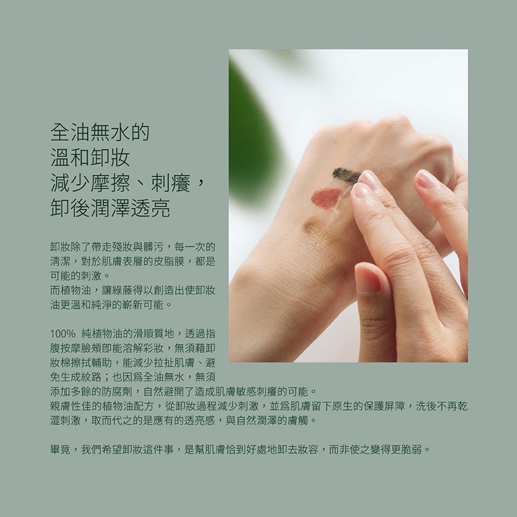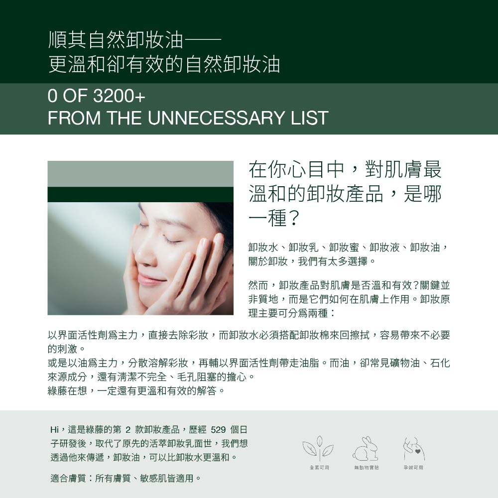 *提醒事項:沒有一個產品適合每一個人,如果使用後有任何皮膚敏感不適,請您先停用、觀察後續皮膚狀況,並聯繫綠藤客服,或視情況尋求醫師協助。