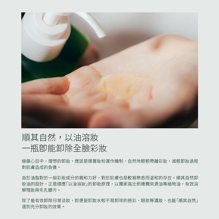 以嶄新高比例植物油配方,打造更溫和卻有效的自然卸妝油。多些以油溶妝的卸妝本質,少些非必要的刺激與殘留。深入了解油、水卸妝的差異,揮別過與不及的油膩、緊繃。