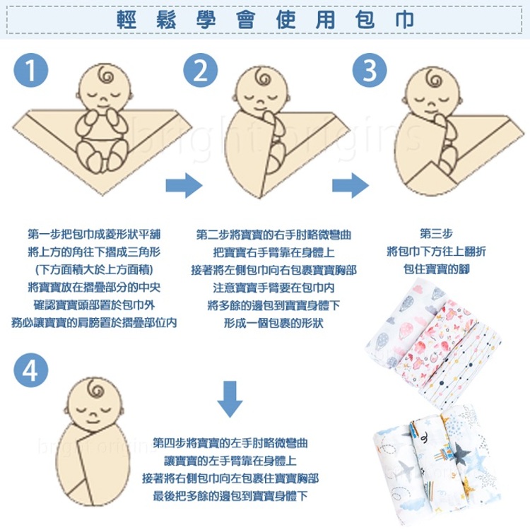 ◎紗布包巾有多種用途:媽媽外出的哺乳巾、寶寶的輕薄蓋毯、推車遮巾、遮陽巾、遊戲毯、野餐毯