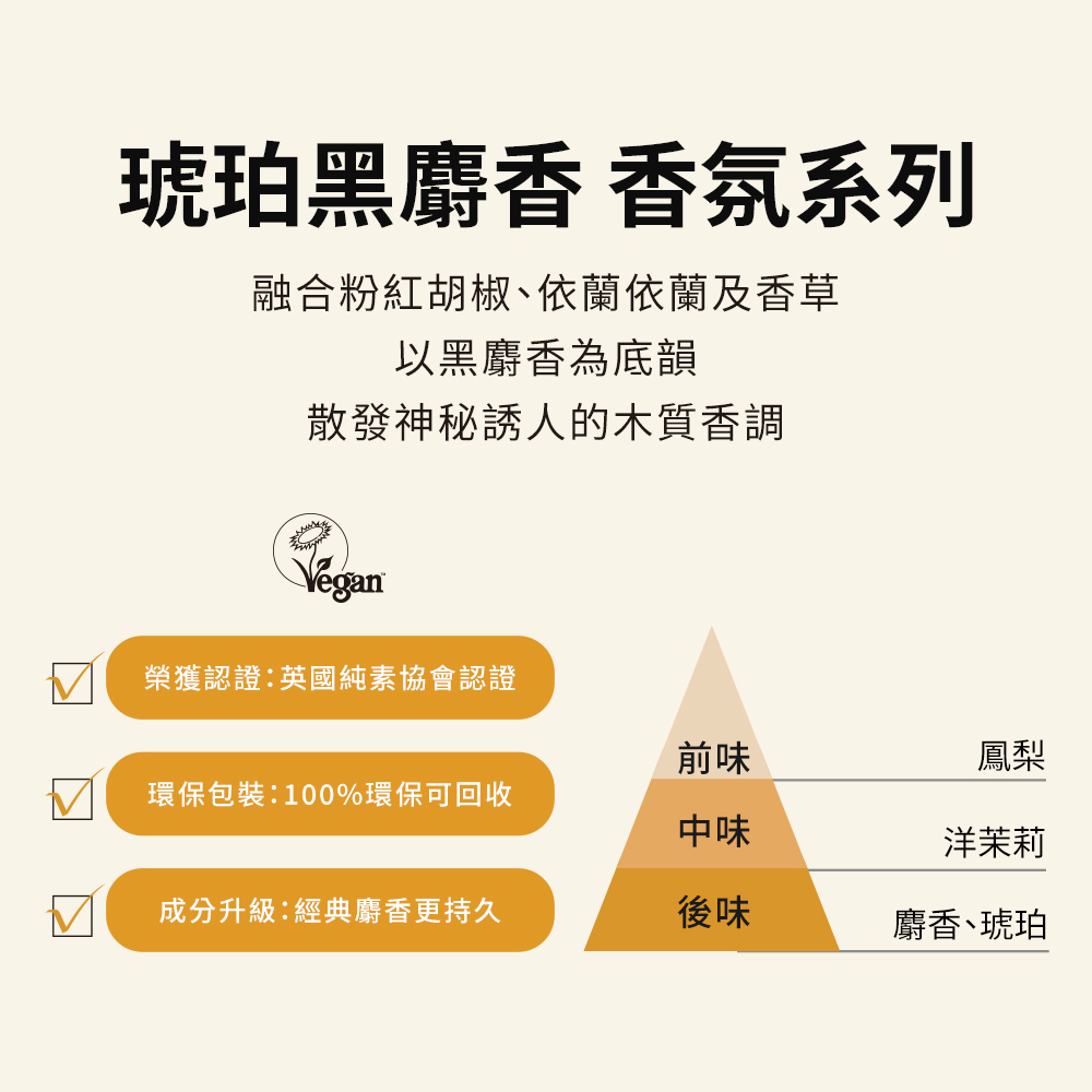 成份: 融合洋茉莉及鳳梨,以琥珀麝香為底韻,散發性感魅惑的東方情調。天然純淨的植物性酒精,溫和無負擔,100%全素香氛。