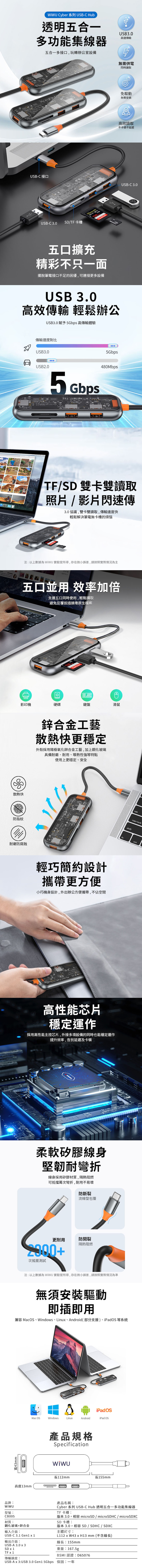 • 5個接口可同時使用• 3口USB3.0高速傳輸數據,提高工作效率• 高速讀卡SD/TF,免裝驅動,即插即用• 鋼化玻璃+鋅合金材質,耐刮、防撞、散熱佳• 柔軟矽膠線身,隔熱阻燃且堅韌耐彎折• 新款iPad Pro及Macbook都適用• 通過認證BSMI認證