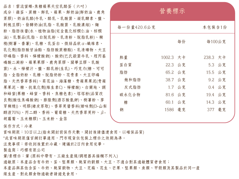 商品內容名稱:雲流蜜蝶-焦糖蘋果天空乳酪(六吋)貨號:010101061材質:食品尺寸:直徑約 14.5 cm,高度約 7 cm葷/素:葷回溫方式:冷藏回溫3小時以上,常溫回溫30分鐘。