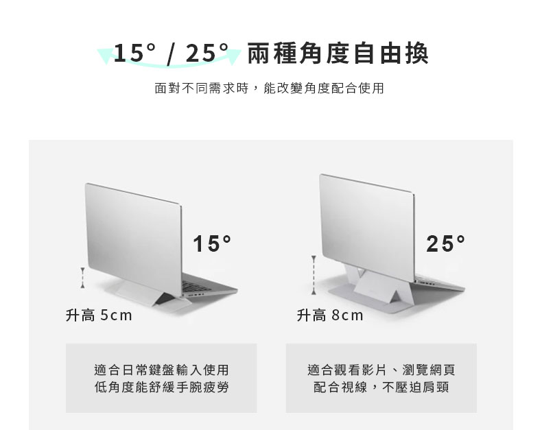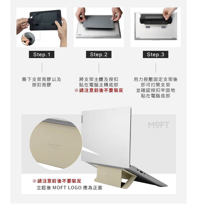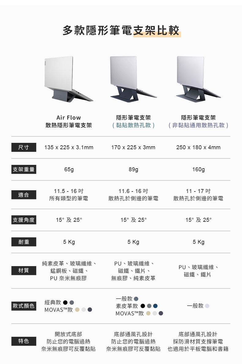 名稱:MOFT Airflow隱形筆電支架顏色:象牙灰、星空灰、經典黑、MOVAS™(沙漠金、迷霧灰、海峽藍)規格:11.5吋-16吋尺寸:135x225x3.1mm耐重:5kg角度:15°、25°材質:純素皮革、玻璃纖維、錳鋼板、磁鐵、PU奈米無痕膠產地:中國