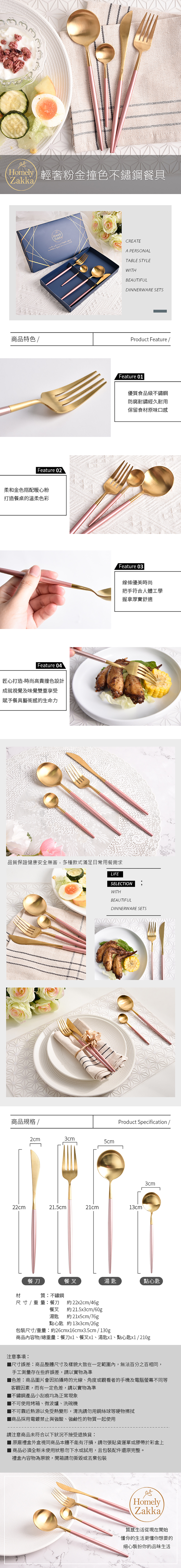★一日三餐創造餐桌美學■優質食品級不鏽鋼,防腐耐鏽經久耐用,保留食材原味口感■匠心打造成就視覺及味覺雙重享受■極致餐桌美學風格-時尚高貴撞色設計■柔和金色搭配暖心粉,打造餐桌的溫柔色彩■線條優美時尚,把手符合人體工學,握拿厚實舒適■品質保證健康安全無害,多種款式滿足日常用餐需求■品味盡顯在指尖,拿上手便讓你愛不釋手■美不勝收的高品質刀叉餐具,賦予餐具充滿藝術感的生命力