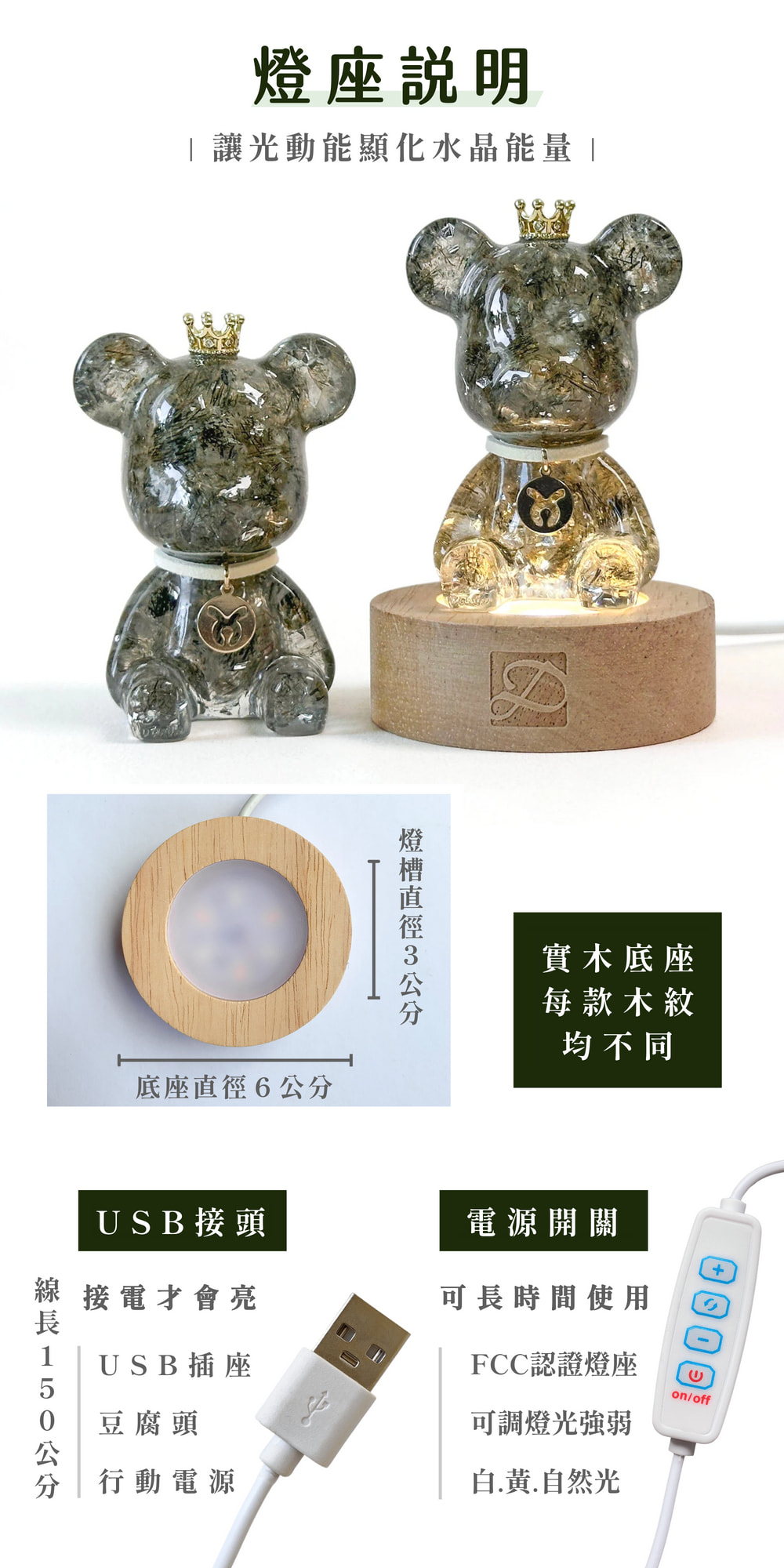 ◿ 尺寸:直徑6CM • 燈槽直徑3CM • 高度2CM◿ 功率:5W及以下◿ 電壓:≤ 36(含)◿ 電流:1A~2A◿ 線長:1.5米USB線