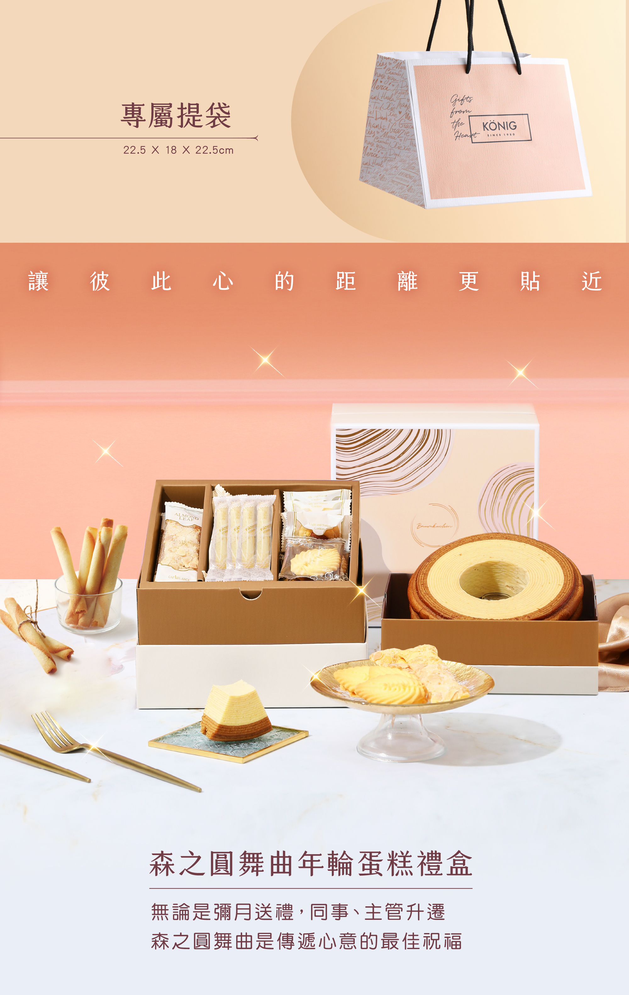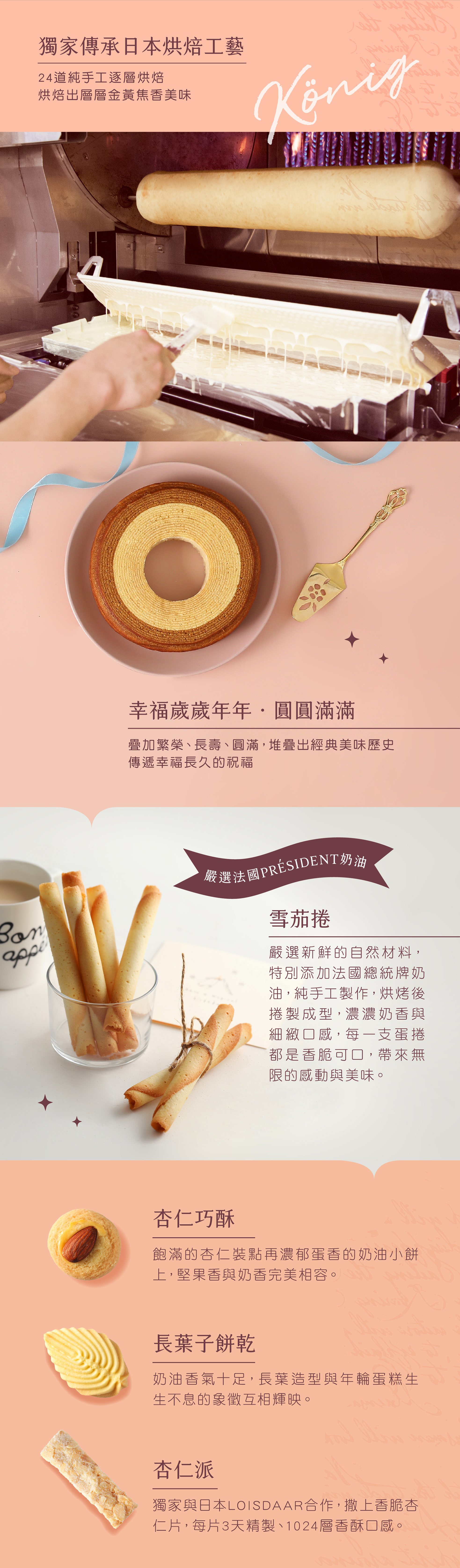 每塊經道道純手工逐層烘烤,構築扎實層次、高雅鬆軟綿細、質地溫潤精緻的口感。而層層形狀像樹輪般的花紋,帶著深深祝福與象徵長壽繁榮、圓滿長久。