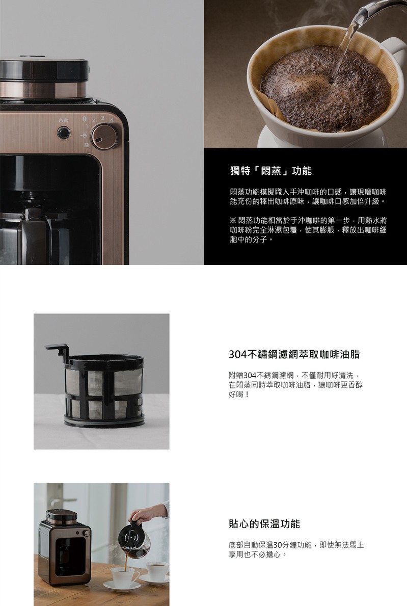 ◆自動悶蒸功能,利用兩段式滴煮悶蒸,萃取出咖啡的濃純原味