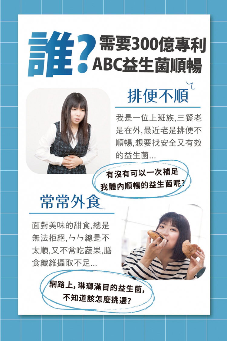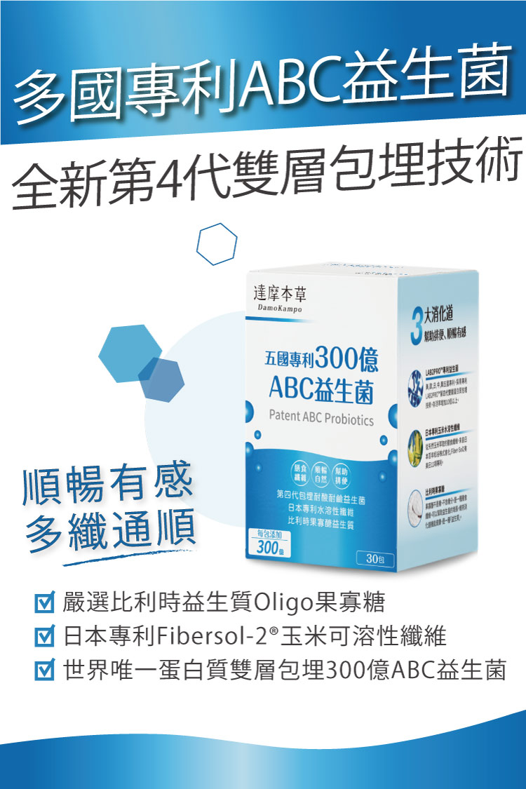 品名:【達摩本草】五國專利300憶ABC益生菌(30包/盒)內容物成分:美國專利玉米來源可溶性纖維、麥芽糊精、果寡糖、乳酸菌粉 (雷特氏乳酸菌、嗜酸乳桿菌、乾酪乳桿菌、 比菲德氏龍根菌、海藻糖、玉米澱粉)食品添加物名稱:請詳見產品外包裝標示商品內容量:30包/盒食用方式:成人每日空腹1包,加強排便順暢,可早晚空腹各食用1包。原產地(國):台灣