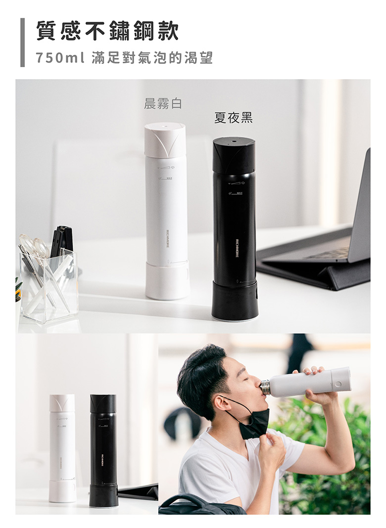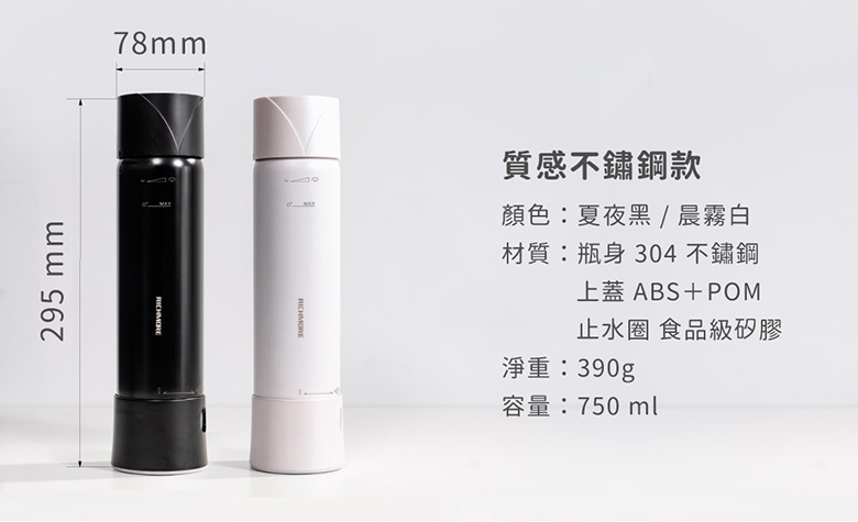 【不鏽鋼款】 顏色:夏夜黑/晨霧白材質:瓶蓋 ABS+POM/瓶身 304不鏽鋼/止水圈 食品級矽膠 淨重:390g ± 2 %容量:750ml ± 5%尺寸: Ø 78 mm x H 295 mm打氣壓力:0.65 MPa耐熱水溫:1~40℃產地:台灣品牌/中國製造/台灣監製