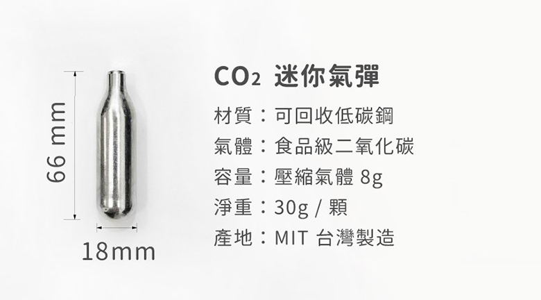 【CO2食品級二氧化碳迷你氣彈】壓縮氣體:8 g淨重:30 g材質:可回收低碳鋼產地:台灣製造