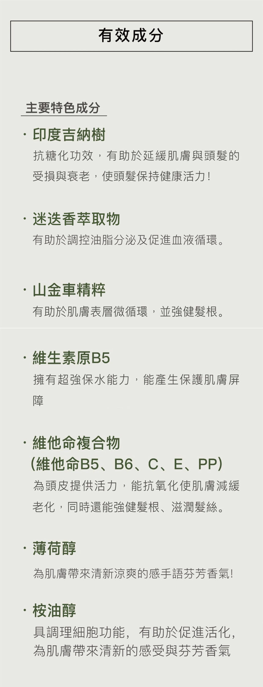 成分 : 印度吉鈉樹、迷迭香萃取物、山金車精粹、維生素B5、維他命複合物、薄荷醇、桉油醇