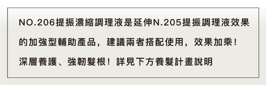 [NO.206 提振濃縮調理液]NO.206提振濃縮調理液是延伸N.205提振調理液效果的加強型輔助產品,建議兩者搭配使用,效果加乘! 深層養護、強韌髮根!