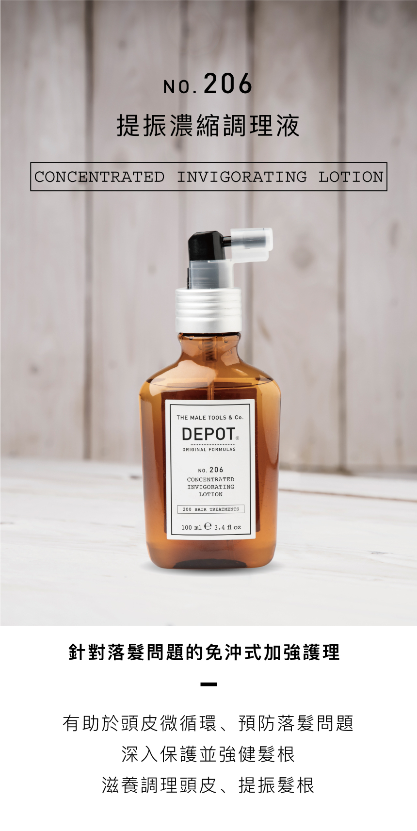 [NO.206 提振濃縮調理液]• 容量 : 100ml• 有助於頭皮微循環、預防落髮問題• 深入保護並強健髮根• 滋養調理頭皮、提振髮根