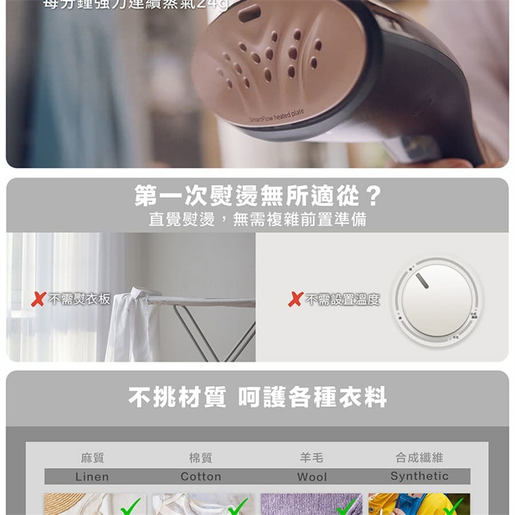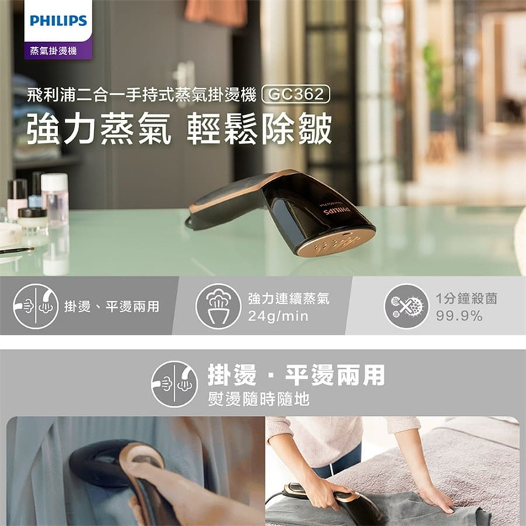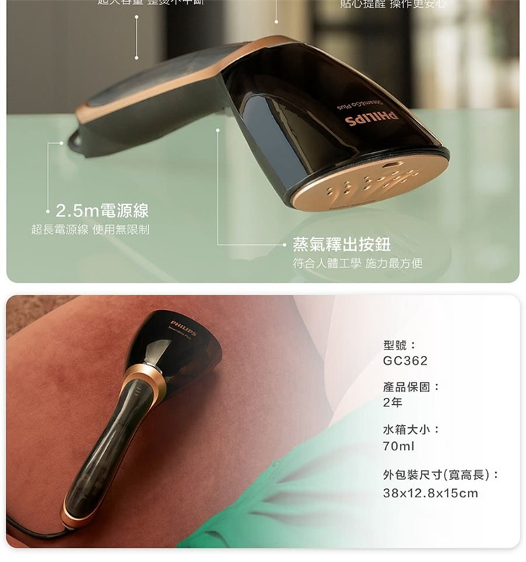 。型號:GC362。尺寸:12.8cm x 38cm x 15cm(L x W x H cm)。淨重 Kg:0.74 kg。連續蒸氣:多達 24 g∕分。水箱容量:70 ml。功率:1300W。電源線長度:2.5 m。保固:全球2年。產地:China。飛利浦服務專線0800-231-099商檢字號:R3D904**為確保產品效能, 飛利浦熨斗掛燙機產品出廠前用水測試過。水箱內有水珠為正常狀況,敬請安心選購**