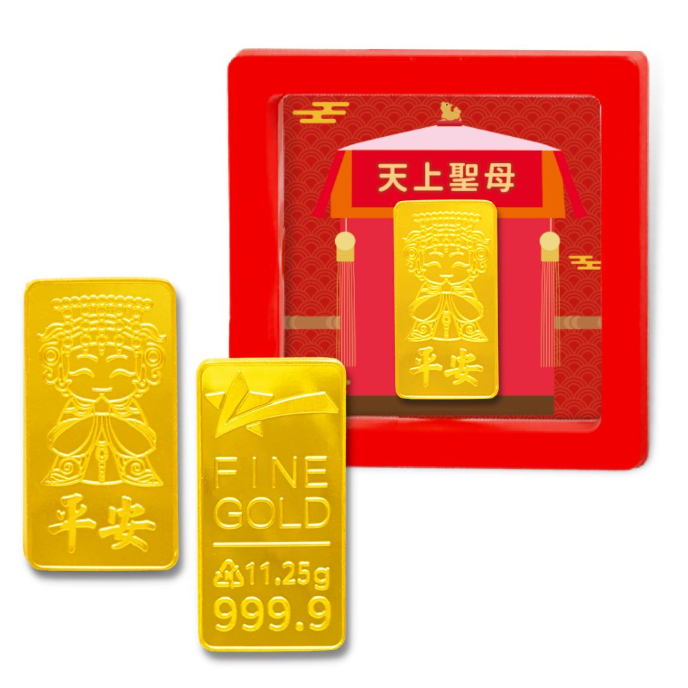 名稱:黃金3錢金塊金條 媽祖賜福獨家設計 (參台錢11.25g)材質:純金999.9金重:黃金3台錢(11.25公克)尺寸:如實品配備:包裝盒x1、保證卡x1、手提袋x1
