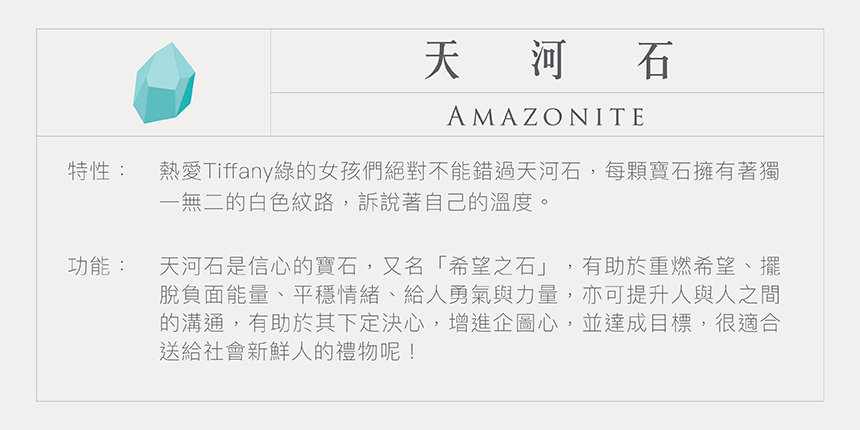 // 天河石 Amazonite //是一種可以增加自信的幸運寶石,又名「希望之石」。可以令人變得積極,避免出現鑽牛角尖的負面情緒亦可以提升人與人之間的溝通。