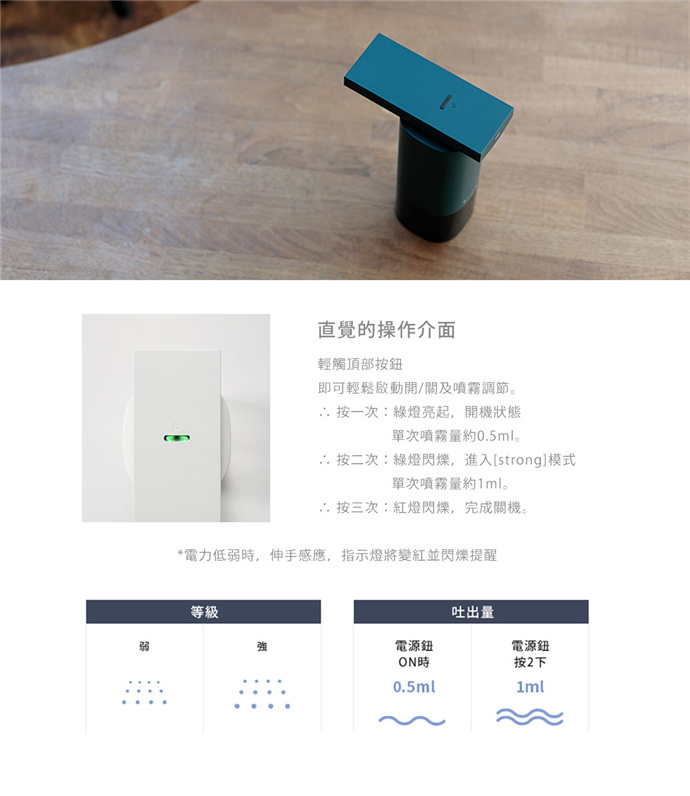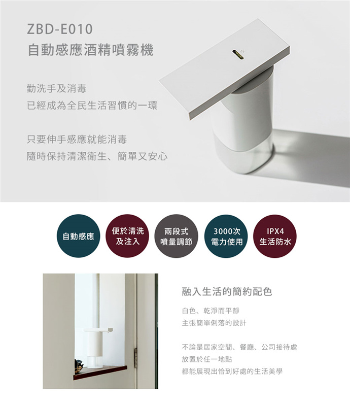型號 : E010產地 : 台灣保固 : 12個月材質:ABS樹脂、PC樹脂防水性:IPX4(防潑水)電池規格:4顆3號鹼性電池尺寸 : H198x W70 xD135 mm噴霧定量:約0.5ml(標準)/1.0ml(強)最大容量:約250ml(約可噴灑250~500次)貨源 : 台灣代理商公司貨備註:本產品僅適用液態酒精,不適用於酒精膏。