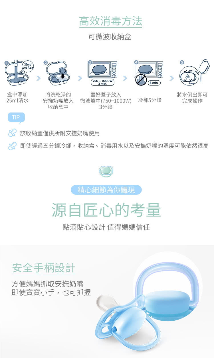 消毒器/便攜盒您可將嬰兒安撫奶嘴存放在便攜盒中,然後放入微波爐消毒,消毒後即可隨身攜帶,既衛生又方便。此商品為貼身物品,除商品瑕疵外,一經拆封使用恕不接受退換貨