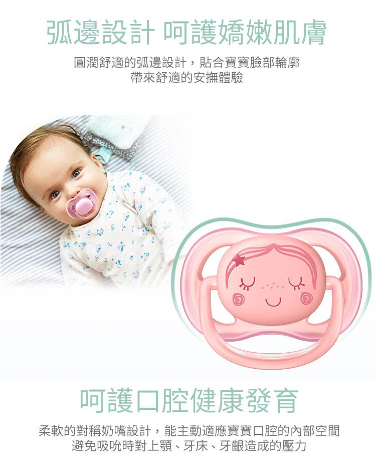 4個透氣孔讓敏感肌膚清爽透氣弧形設計,舒適安撫呵護口腔健康發展可用於微波爐消毒柔軟親膚水滴設計舒適吸吮矯齒設計及不含雙酚A