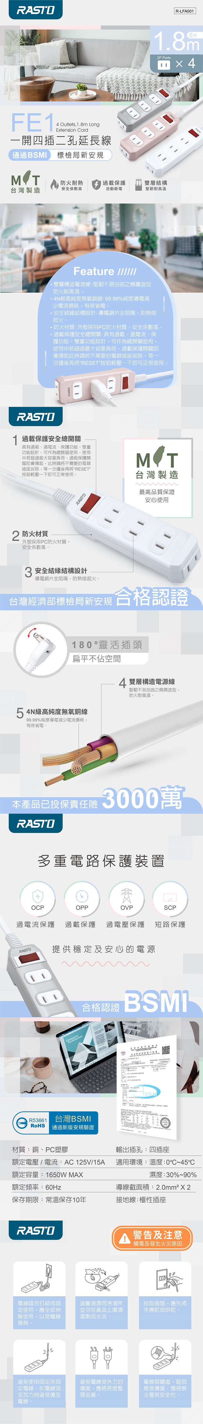 .BSMI識別碼:R53661 驗證型號:SW214-6.雙層構造電源線-堅韌不易扭曲之橢圓造型,防火耐高溫.4N級高純度無氧銅線-99.99%純度導電減少電流損耗,有效省電.安全結緣結構設計-導電銅片全阻隔,防熱熔起火.防火材質-外殼採用PC防火材質,安全係數高.過載保護安全總開關-具有過載、過電流、保護功能.雙重功能設計,可作為總開關使用,使用中若超過最大容量負荷過載保護開關即會彈起, 此時請將不需要的電器插座拔除,等一分鐘後再將“RESET"按鈕輕壓一下即可正常使用。