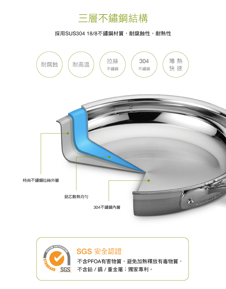 • 高品質鋼材外層SS430厚度0.6毫米,中間層鍋芯: 純鋁,內層 SS304厚度0.4毫米