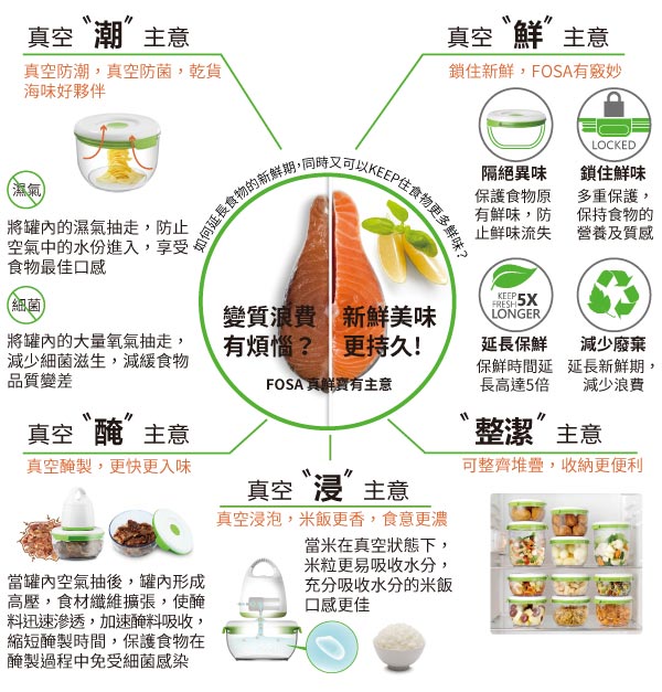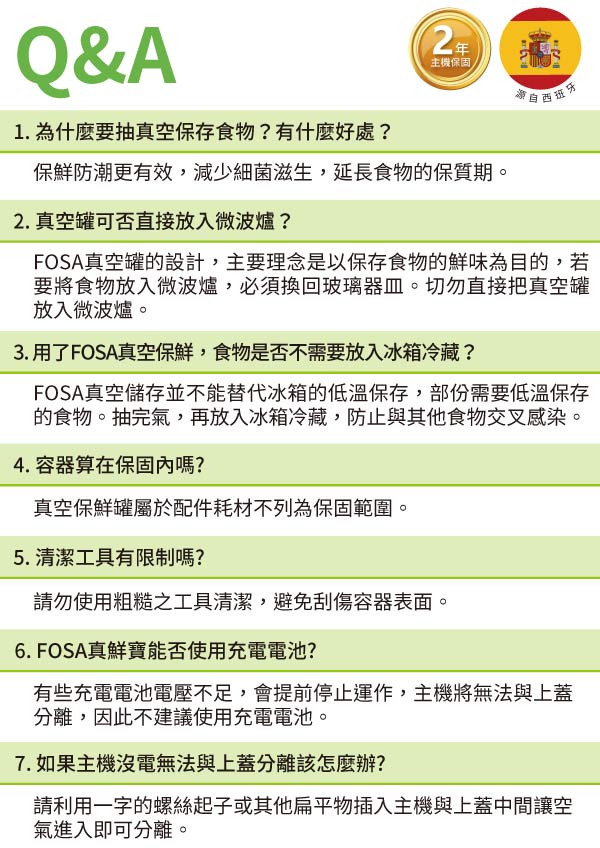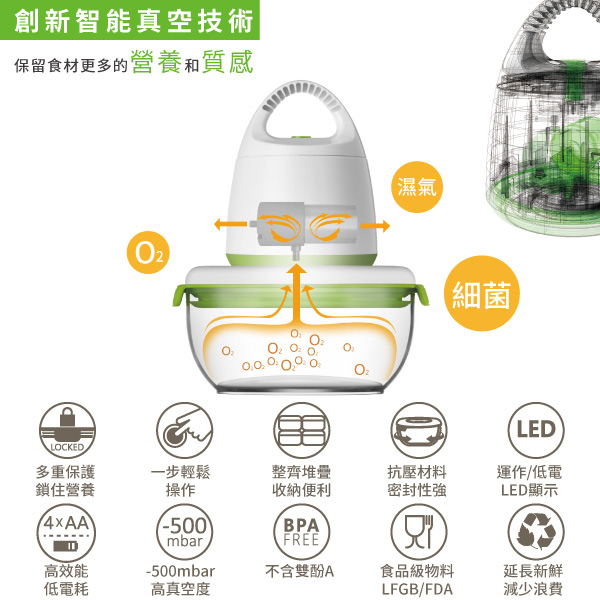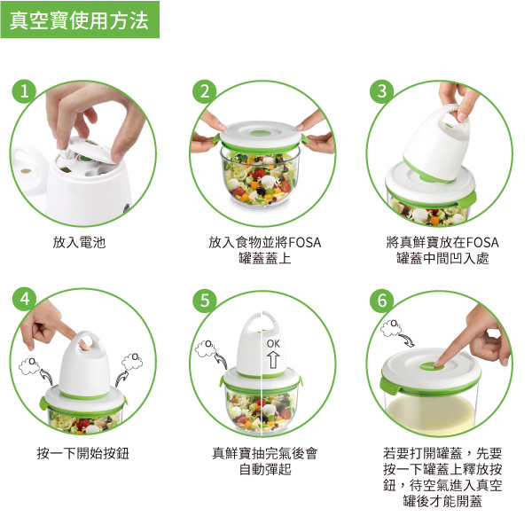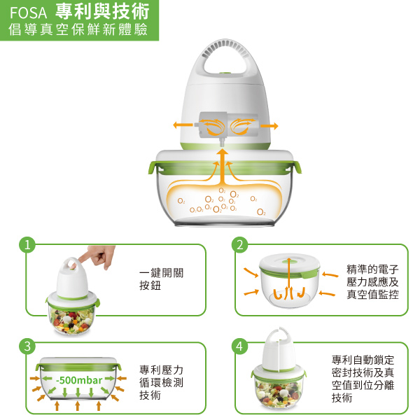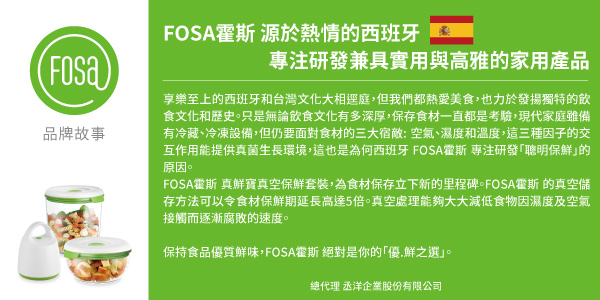 設計:西班牙 產地:中國600ml保鮮盒四個(不含主機)※ 此商品不含主機,請先購買FOSA真鮮寶智能真空保鮮套裝(HFA30010)!※保鮮盒蓋子部分請用濕布清潔,勿用水沖或浸在水裡,以免影響抽真空效果!.商品不提供試用服務,商品一經放入食材造成異味及汙損,供應商不接受退換貨。 .收到商品請立即確認是否可以運轉,一旦超過鑑賞期即表示接受商品。.請遵照說明書使用方式使用,延長商品壽命。