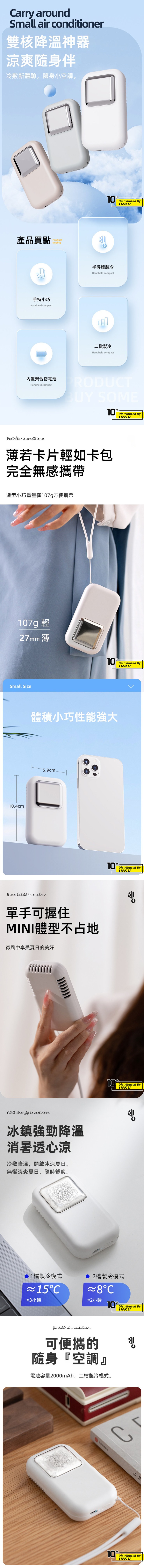 可便攜的隨身『空調』電池容量2000mAh,二檔製冷模式。