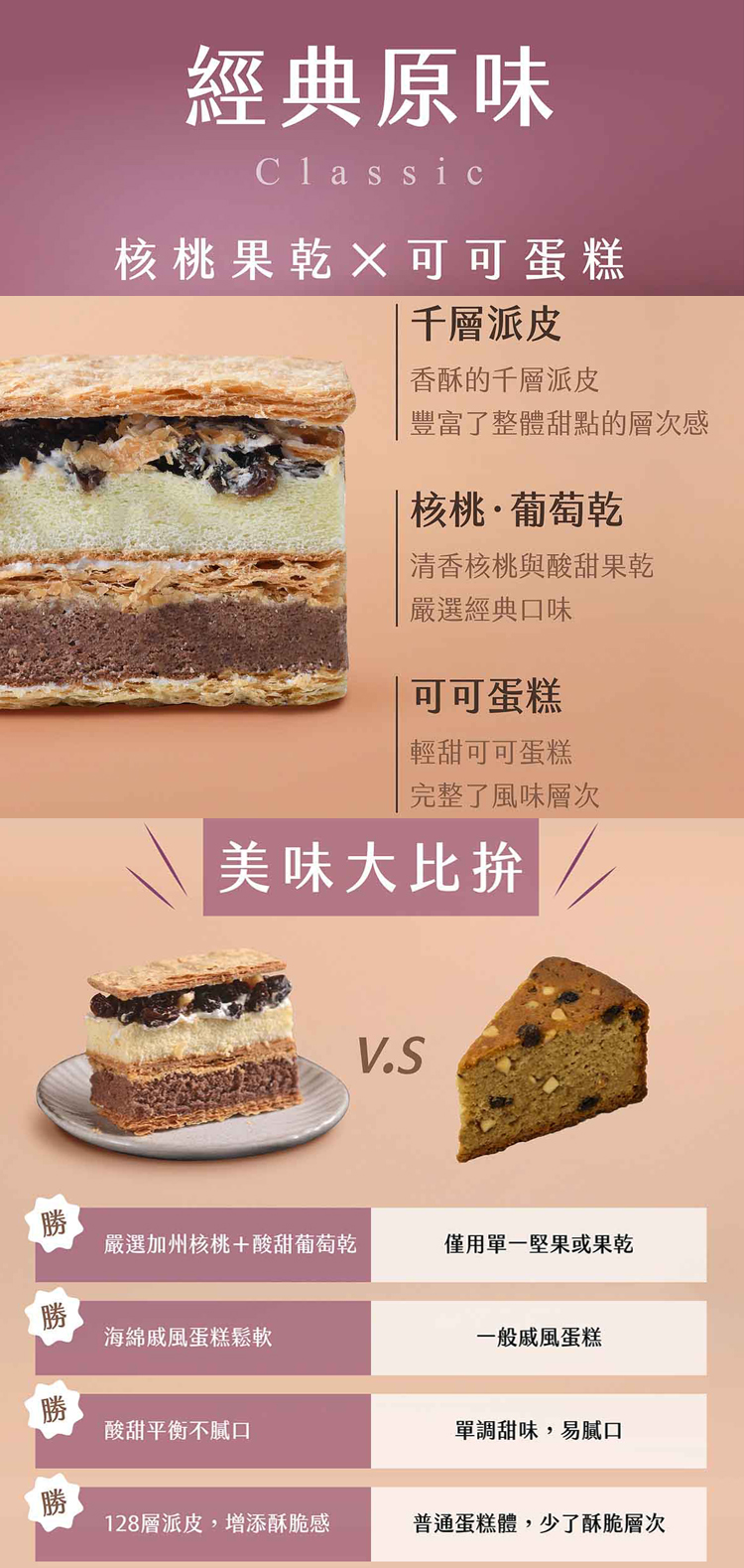 1.商品組合/規格:經典濃黑巧克&日系抹茶千層任選2+2千層組(4入組/口味任選)2.商品品名:經典夏日芒果&日系抹茶千層任選2+2千層組(4入組/口味任選)3.商品重(容)量:16 × 6 × 6 (公分)/1盒 共4盒4.內容物名稱(成分):麵粉、奶油、蛋、糖、牛奶、香草醬、核桃、 葡萄乾5.食品添加物名稱:無6.原產地(國):台灣7.製造廠商或國內負責廠商名稱:樂天派股份有限公司8.製造廠商或國內負責廠商地址:台北市中山區南京西路1-1號(621室)9.製造廠商或國內負責廠商電話:022511593710.以消費者收受日算起,至少距有效日期前?日以上:最佳賞味期3天,冷凍14天