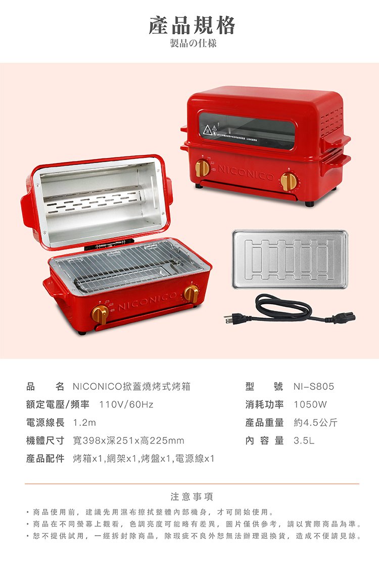商品規格 商品名稱:NICONICO掀蓋燒烤式蒸氣烤箱 NI-S805商品尺寸: 398 (W) x 251 (D) x 225 (H) mm包裝尺寸: 435 (W) x 295 (D) x 305 (H) mm內容量:3.5L商品重量:4.5KG總重量:5.7KG額定電壓/頻率:110V~60Hz額定消耗功率:1050W