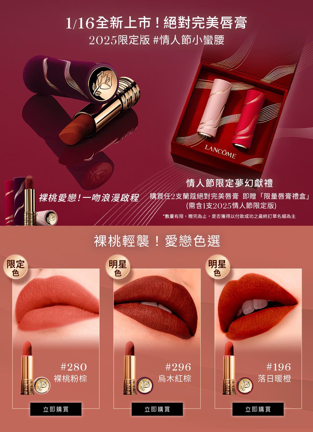 裸桃愛戀!一吻浪漫啟程#280 裸桃粉棕成熟溫柔裸桃棕,優雅展現真我#296 烏木紅棕熱情似火深邃紅,點燃內心奔放力量#196 落日暖橙經典復古胡蘿蔔紅,綻放法式自信魅力