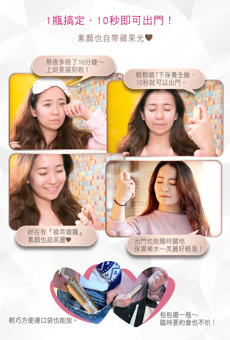 一次解決你所有煩惱!左臉3下,右臉3下,中間1下,靜置一分鐘不拍打。自然吸收,Magic~奇蹟出現!不論白天黑夜,即使上妝完了也可以噴哦!(妝感更服貼)