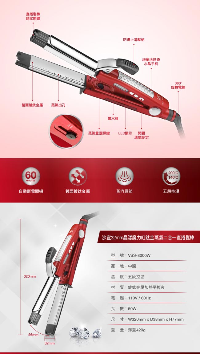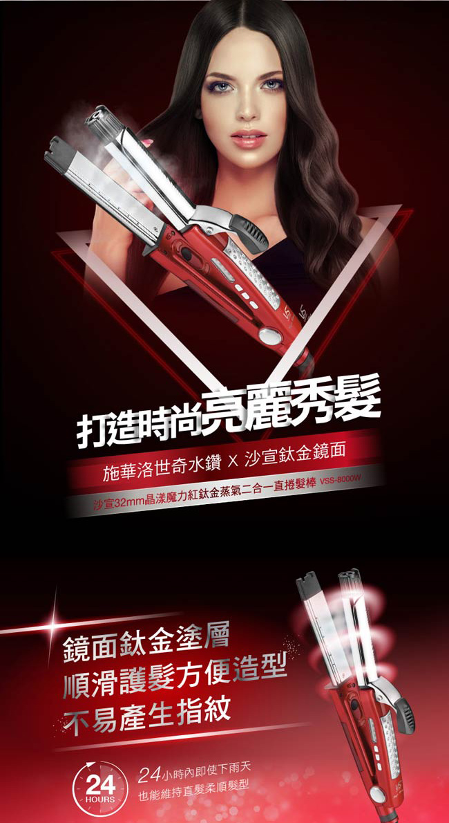 ◆型號:VSS-8000W◆材質:鍍鈦金屬加熱平板夾◆額定電壓/頻率:110V/ 60Hz◆消耗功率:50W◆尺寸:長32x寬3.8x高7.7(cm)◆重量:420g◆產地:中國◆國際條碼:4892684022456◆保固:原廠保固2年◆BSMI:CI397065190396號A1