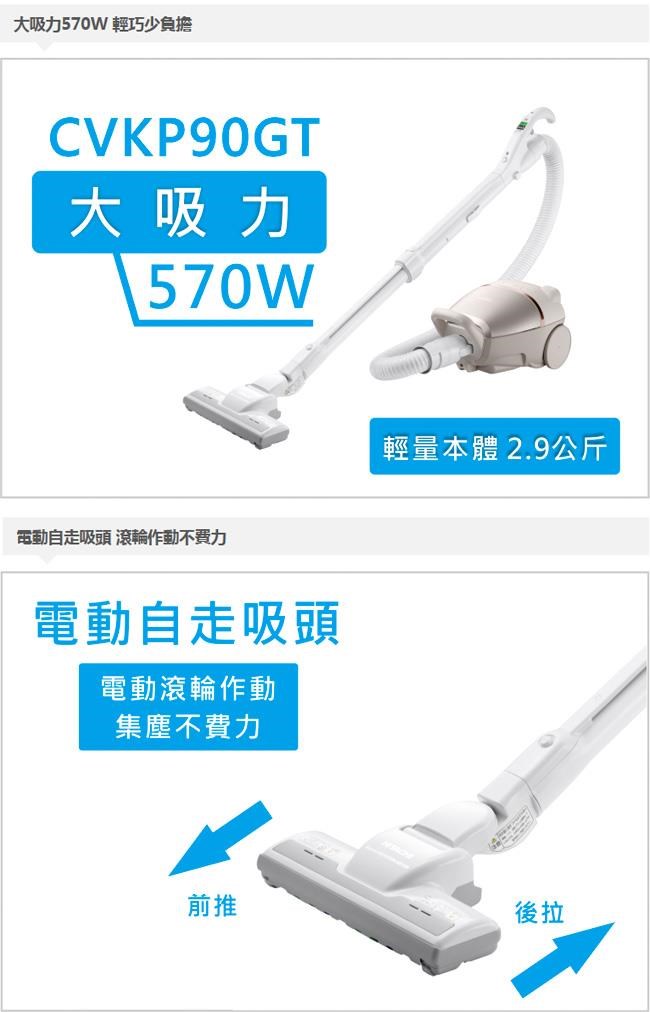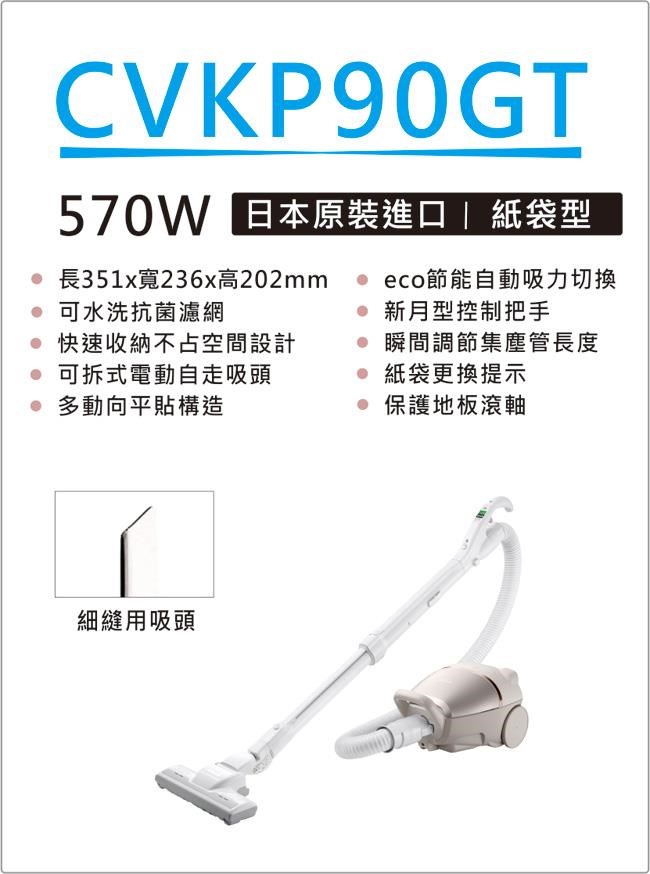 型號:CVKP90GT吸力(W):570W 顏色:香檳金 尺寸(mm) 長X寬X高:351X236X202 本體(含配件)重量kg:2.9(4.6)kgBSMI:R31270產地:日本 標準配件:電動吸頭/細縫吸頭 適用GP110F(日製集塵紙袋)/CVP6(台製集塵紙袋)/ECO節能感知吸力切換