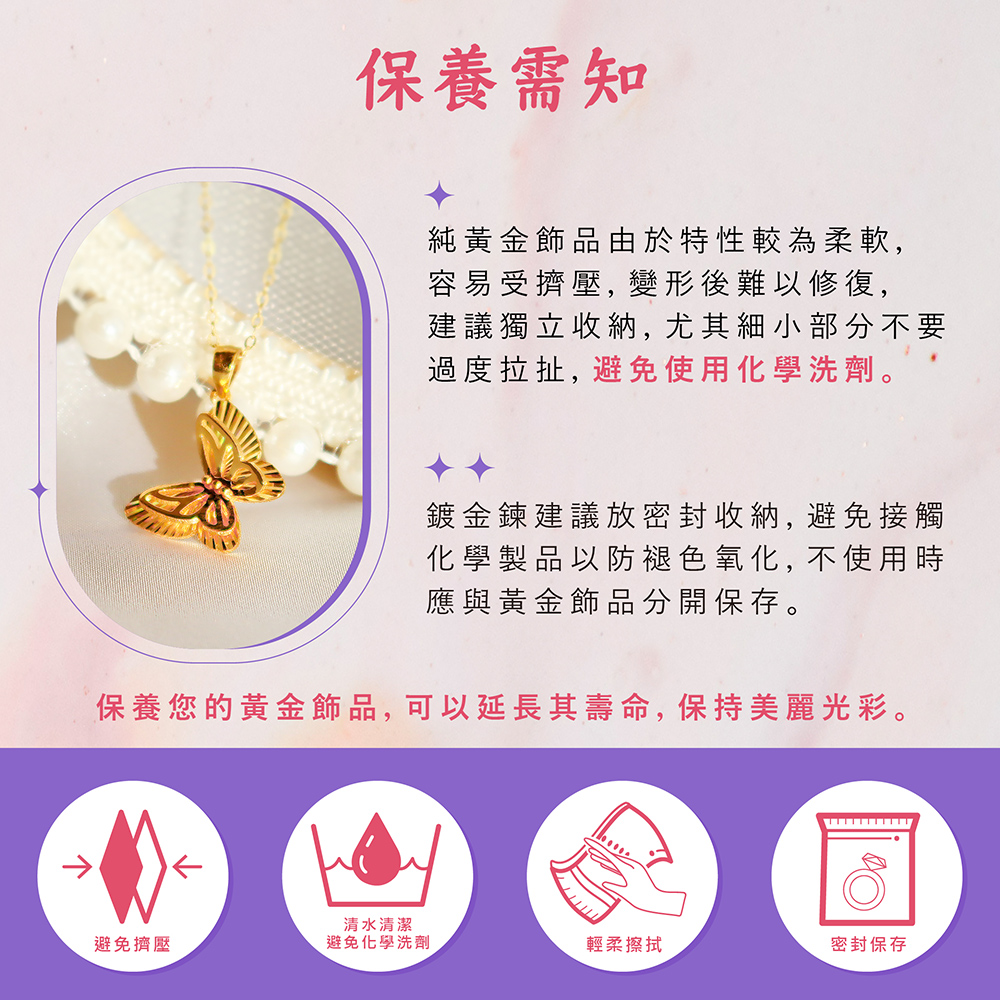 ◆黃金特性柔軟,碰撞擠壓易變形,配戴時請小心。硬金金飾因生產工藝特殊,壓損無法修復。