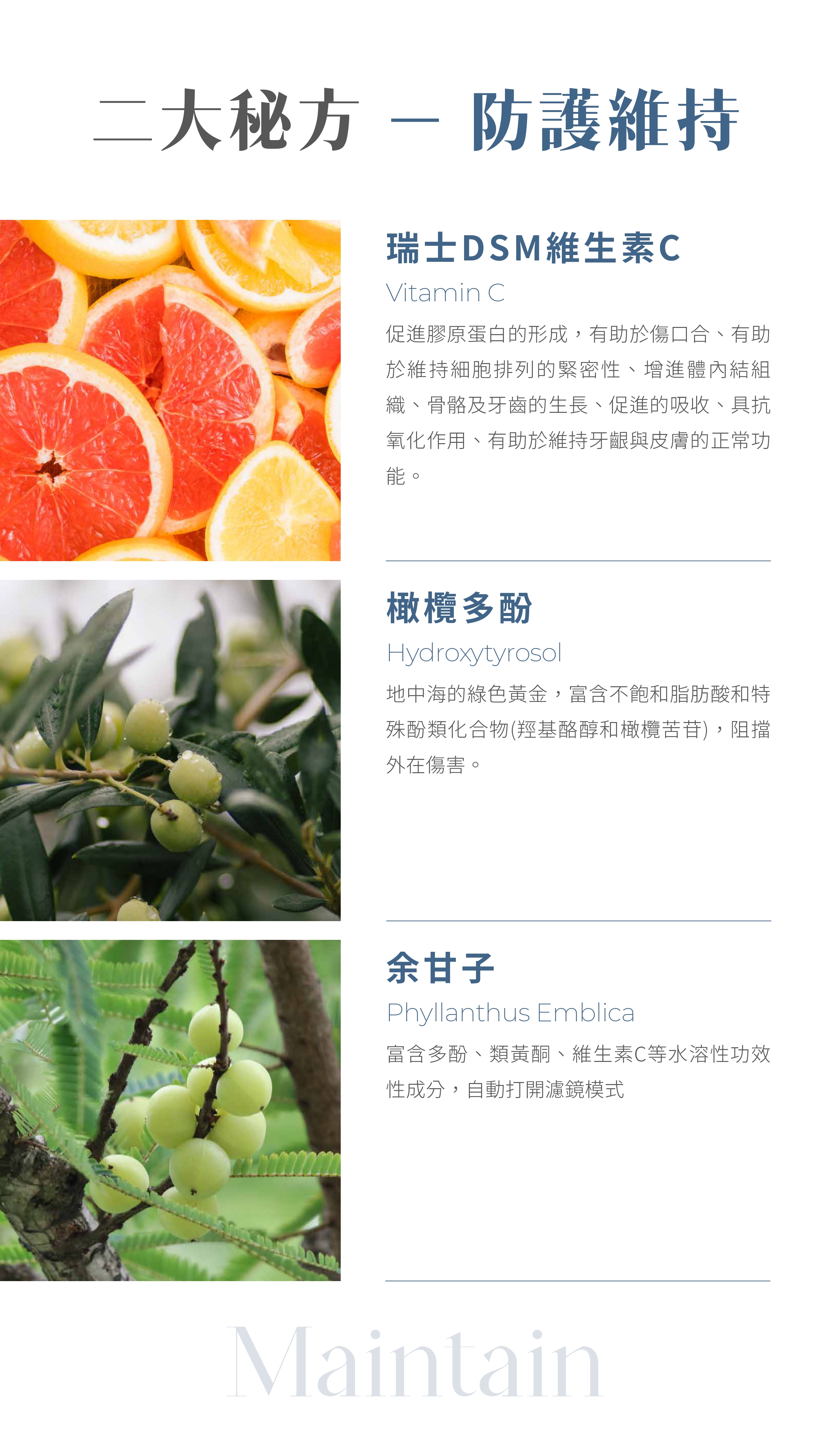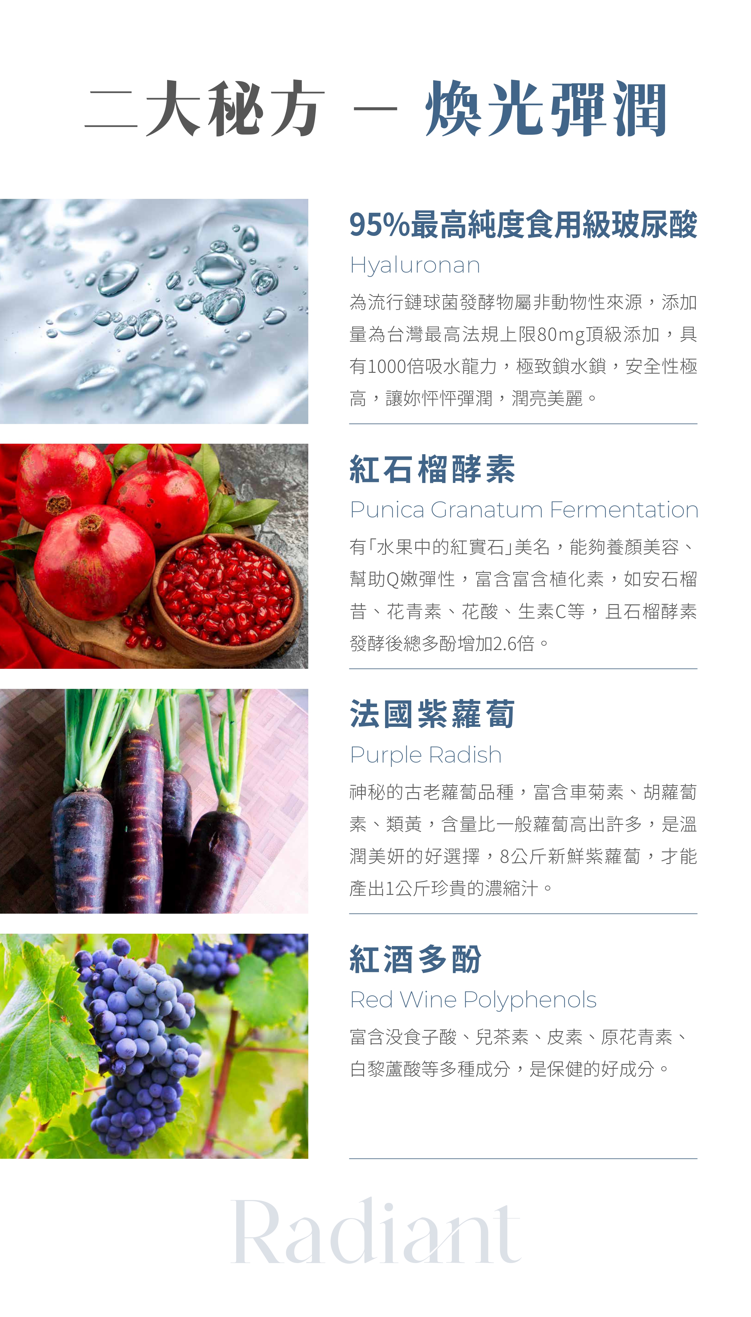 [主要成分]❄️專利紅石榴發酵物 (獲國際獎):石榴多酚含量極具養顏美容效果❄️最高含量80毫克的95%高純度玻尿酸:頂規呵護水潤外在❄️專利青花菜苗萃取(獲國際獎):豐富幼苗活性成分,外在重現活力❄️法國紫蘿蔔:高含量類黃酮,溫潤美妍選擇❄️瑞士DSM維生素C:助膠原蛋白形成、抗氧化、促進鐵吸收,讓氣色變好❄️紅酒多酚:白藜蘆醇具多種保健功能,延緩惡勢力侵襲❄️橄欖萃取:富含抗氧化多酚,阻擋外在傷害❄️余甘子:富含超級抗氧分子,自動打開煥光模式
