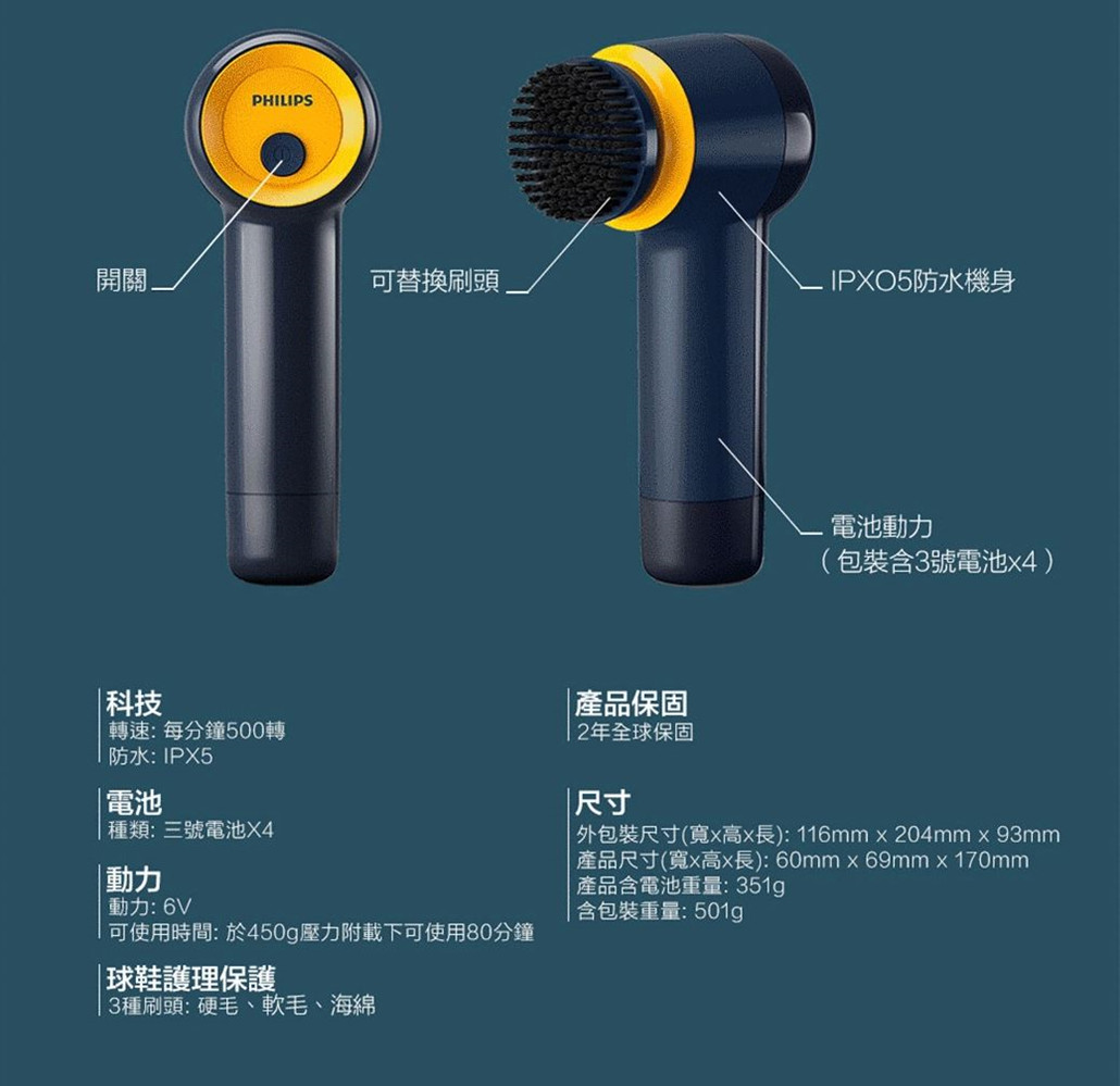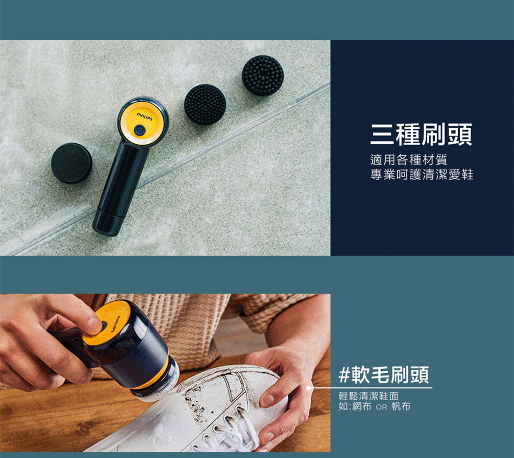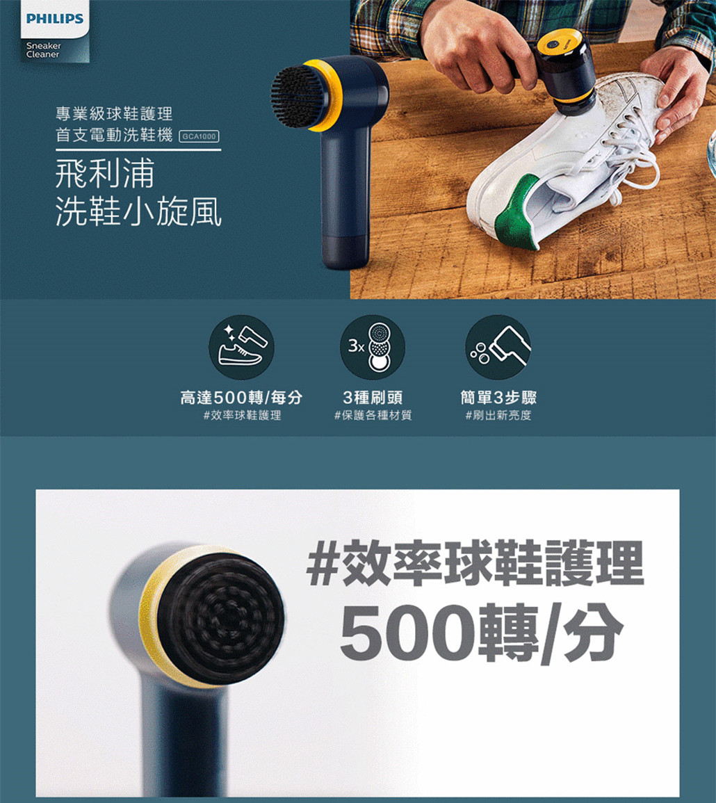 鞋不求人!飛利浦推「洗鞋機」 免送洗一直都白帥 飛利浦近期推出電動洗鞋機 GCA1000,輕巧手持式設計搭配每分鐘 500 轉高效清潔,以及三種不同性能刷頭,只要三步驟「沾濕刷頭」、「按壓電源」、「擦乾鞋身」,一機即可清洗各種材質的鞋款。根據飛利浦家電調查 ,大眾洗鞋時最常見的四大痛點分別為,擔心清潔不當會傷到鞋子(68%)、不知道最適合的清潔方式(55%)、需花很多力氣清潔(52%)、清潔耗費太多時間(47%)。針對這些需求,飛利浦家電推出飛利浦電動洗鞋機,重新定義護鞋新標準,手持式的輕巧設計讓 DIY 洗鞋不再是難事。 飛利浦電動洗鞋機以靛藍搭配亮黃,機身採 IPX5 的防水等級,使用上更安全;每分鐘高達 500 轉,高效清潔輕鬆搞定頑固污漬;搭載智慧壓力感測功能,當清洗力道過大時,將自動暫時停止運轉,保護愛鞋。此外,搭配三種不同性能刷頭,讓使用者能依鞋款的材質交替使用,硬毛刷頭適用於橡膠、中底或鞋底等較堅硬的材質,軟毛刷頭適用於網布、帆布等泛用型的材質,海綿刷頭則適用於 PVC、皮革、麂皮等較脆弱的材質。使用時只要以清潔劑沾濕刷頭、按壓電源清潔鞋身、最後使用乾布全面擦拭就能完成。商品特色高達500轉/每分效率球鞋護理 3種刷頭適用各種材質 防水等級IPX5使用更安心 長效續航80分鐘 體積輕巧便於攜帶 智能壓力提醒,保護愛鞋 電池動力即換即用 全球兩年保固商品規格品牌 飛利浦型號 GCA1000可清洗物品 鞋子產地 中國重量 351g機體尺寸 6x 6.9 x 17cm保固 2年商品類型 洗鞋機其他配件 3種刷頭: 硬毛、軟毛、海綿電池容量 三號電池X4可使用時間 於450g壓力負載下可使用80分鐘退 / 換貨注意 此為【家庭清潔用品】,鑑賞期之內無法提供試用,一經拆封使用,將會影響退貨權限。依照消費者保護法規定,消費者均享有商品到貨七天鑑賞期之權益。但退回商品必須是全新狀態且完整包裝 (保持商品、附件、包裝、廠商紙箱及所有附隨文件或資料之完整性)。上述規格如有錯誤,請以原廠公告為主