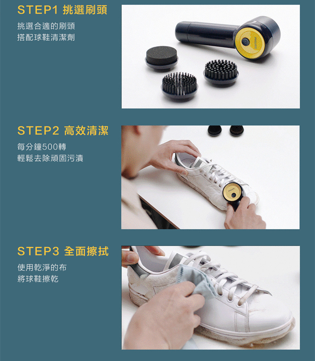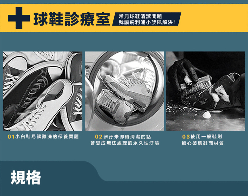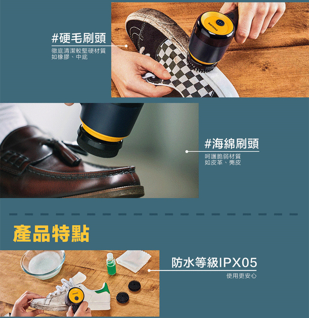 鞋不求人!飛利浦推「洗鞋機」 免送洗一直都白帥 飛利浦近期推出電動洗鞋機 GCA1000,輕巧手持式設計搭配每分鐘 500 轉高效清潔,以及三種不同性能刷頭,只要三步驟「沾濕刷頭」、「按壓電源」、「擦乾鞋身」,一機即可清洗各種材質的鞋款。根據飛利浦家電調查 ,大眾洗鞋時最常見的四大痛點分別為,擔心清潔不當會傷到鞋子(68%)、不知道最適合的清潔方式(55%)、需花很多力氣清潔(52%)、清潔耗費太多時間(47%)。針對這些需求,飛利浦家電推出飛利浦電動洗鞋機,重新定義護鞋新標準,手持式的輕巧設計讓 DIY 洗鞋不再是難事。 飛利浦電動洗鞋機以靛藍搭配亮黃,機身採 IPX5 的防水等級,使用上更安全;每分鐘高達 500 轉,高效清潔輕鬆搞定頑固污漬;搭載智慧壓力感測功能,當清洗力道過大時,將自動暫時停止運轉,保護愛鞋。此外,搭配三種不同性能刷頭,讓使用者能依鞋款的材質交替使用,硬毛刷頭適用於橡膠、中底或鞋底等較堅硬的材質,軟毛刷頭適用於網布、帆布等泛用型的材質,海綿刷頭則適用於 PVC、皮革、麂皮等較脆弱的材質。使用時只要以清潔劑沾濕刷頭、按壓電源清潔鞋身、最後使用乾布全面擦拭就能完成。商品特色高達500轉/每分效率球鞋護理 3種刷頭適用各種材質 防水等級IPX5使用更安心 長效續航80分鐘 體積輕巧便於攜帶 智能壓力提醒,保護愛鞋 電池動力即換即用 全球兩年保固商品規格品牌 飛利浦型號 GCA1000可清洗物品 鞋子產地 中國重量 351g機體尺寸 6x 6.9 x 17cm保固 2年商品類型 洗鞋機其他配件 3種刷頭: 硬毛、軟毛、海綿電池容量 三號電池X4可使用時間 於450g壓力負載下可使用80分鐘退 / 換貨注意 此為【家庭清潔用品】,鑑賞期之內無法提供試用,一經拆封使用,將會影響退貨權限。依照消費者保護法規定,消費者均享有商品到貨七天鑑賞期之權益。但退回商品必須是全新狀態且完整包裝 (保持商品、附件、包裝、廠商紙箱及所有附隨文件或資料之完整性)。上述規格如有錯誤,請以原廠公告為主