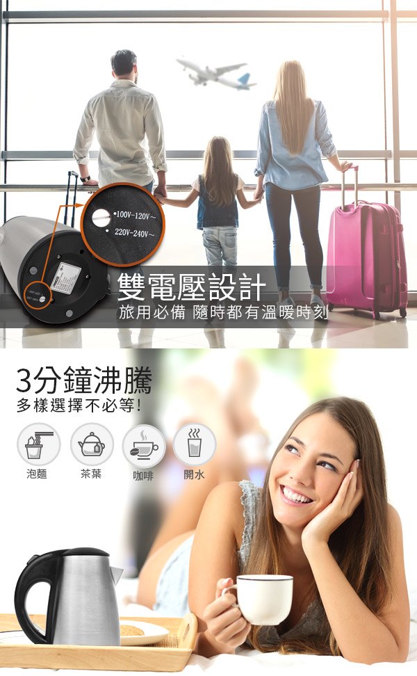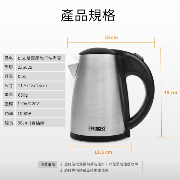 PRINCESS 荷蘭公主 0.5L雙電壓旅用快煮壺 236029 商品特色 .雙電壓切換全球通用 .1000W高功率快速煮沸 .無底座設計方便旅行攜帶 .0.5L三分鐘快速煮沸 .壺內無管線清潔方便 .採用高品質304不鏽鋼 .貼心出水口濾網緩衝設計 .沸騰後自動斷電