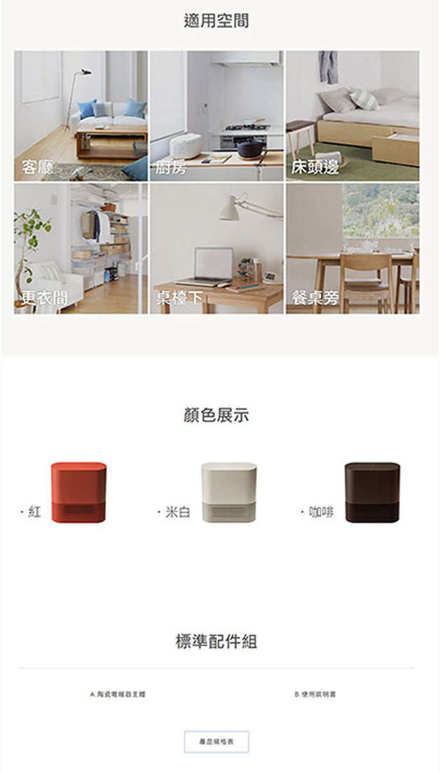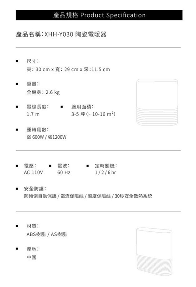 ◎產品尺寸:H300 X W290 X D115mm◎運轉段數:弱 600W.強1200W◎定時關機:1.2.6小時◎自動關機:1小時(未設定定時狀態下,1小時候進入待機狀態)◎電源:AC110V 60Hz◎消耗功率:1200W◎安全防護:防傾倒自動保護、電流保險絲、溫度保險絲、30秒安全散熱系統◎產品配件:使用說明書◎電線長度:約1.7m◎產品重量:約2.6kg◎適用坪數:3 ~ 5坪◎BSMI許可字號:R63586