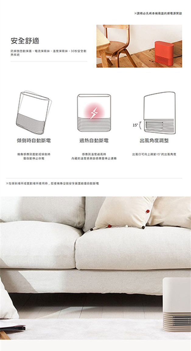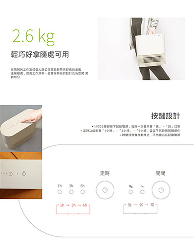●無耗燃料、無噪音、無異味●即開即熱自動調整風力強弱●尺寸輕巧,輕鬆提取、移動●安心設計,震動傾倒自動斷電●3段定時設定,2段風力設定●溫度診斷裝置,溫度過高自動停止●分離式濾網,清洗方便