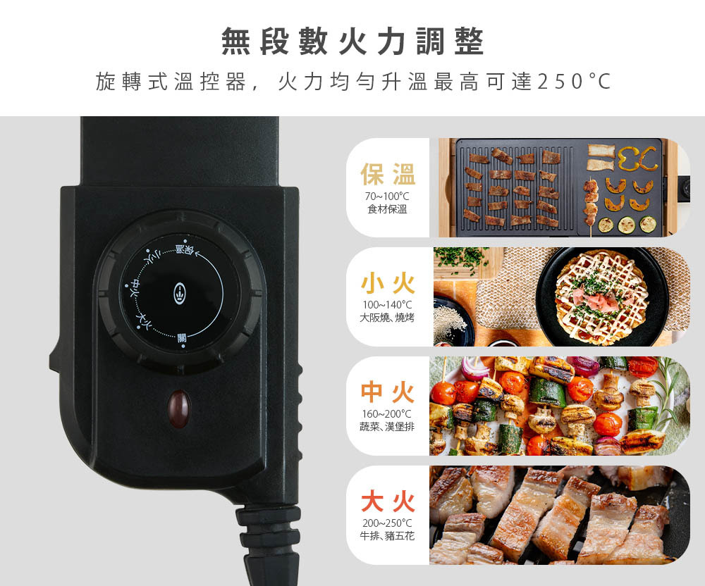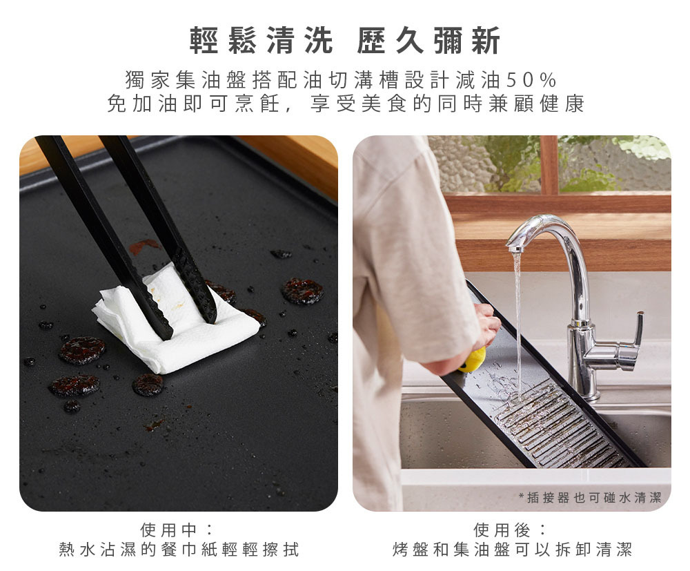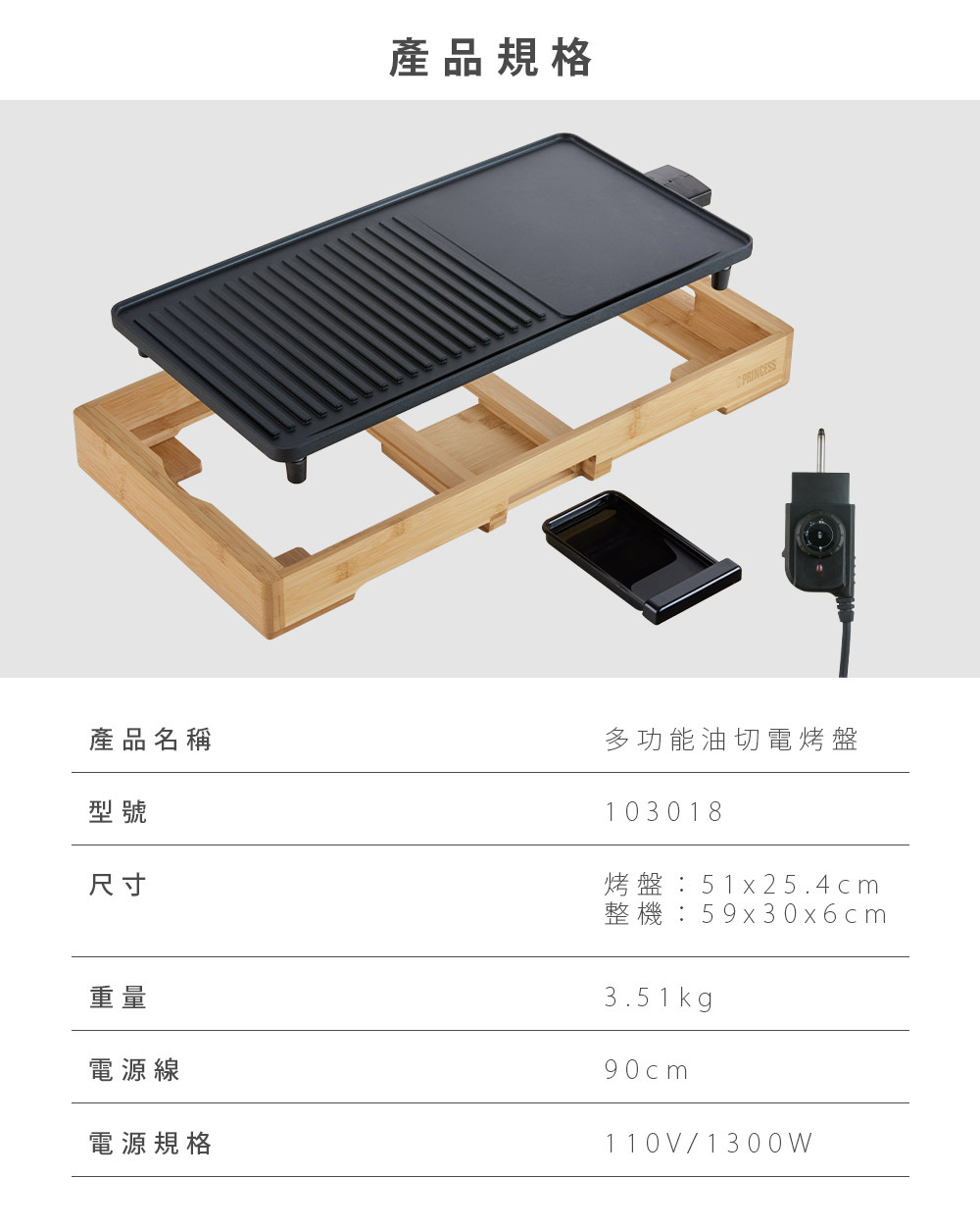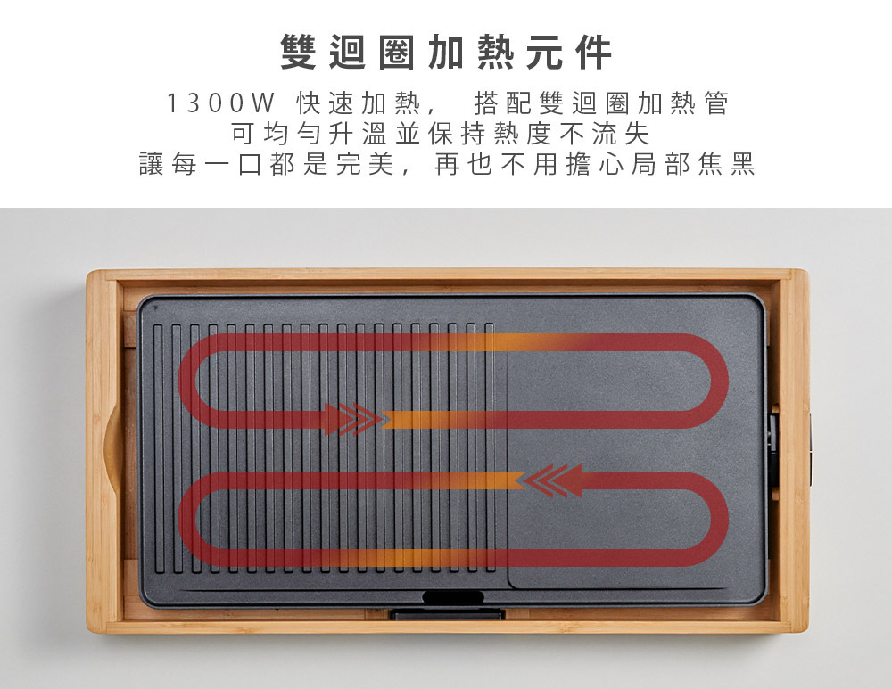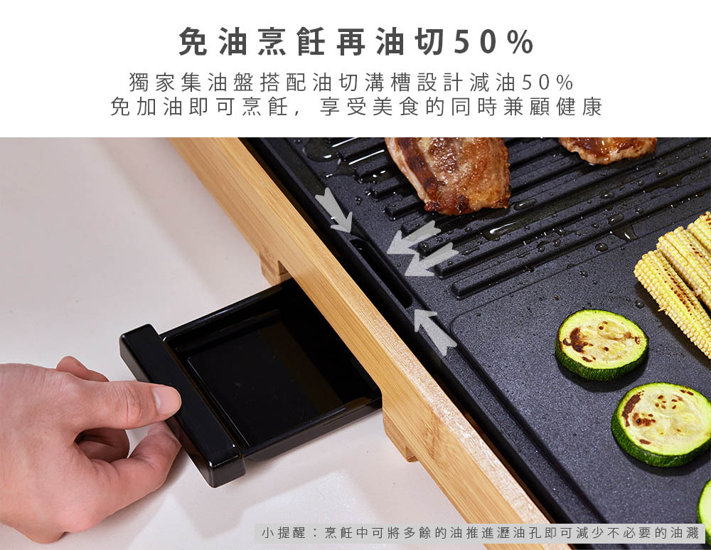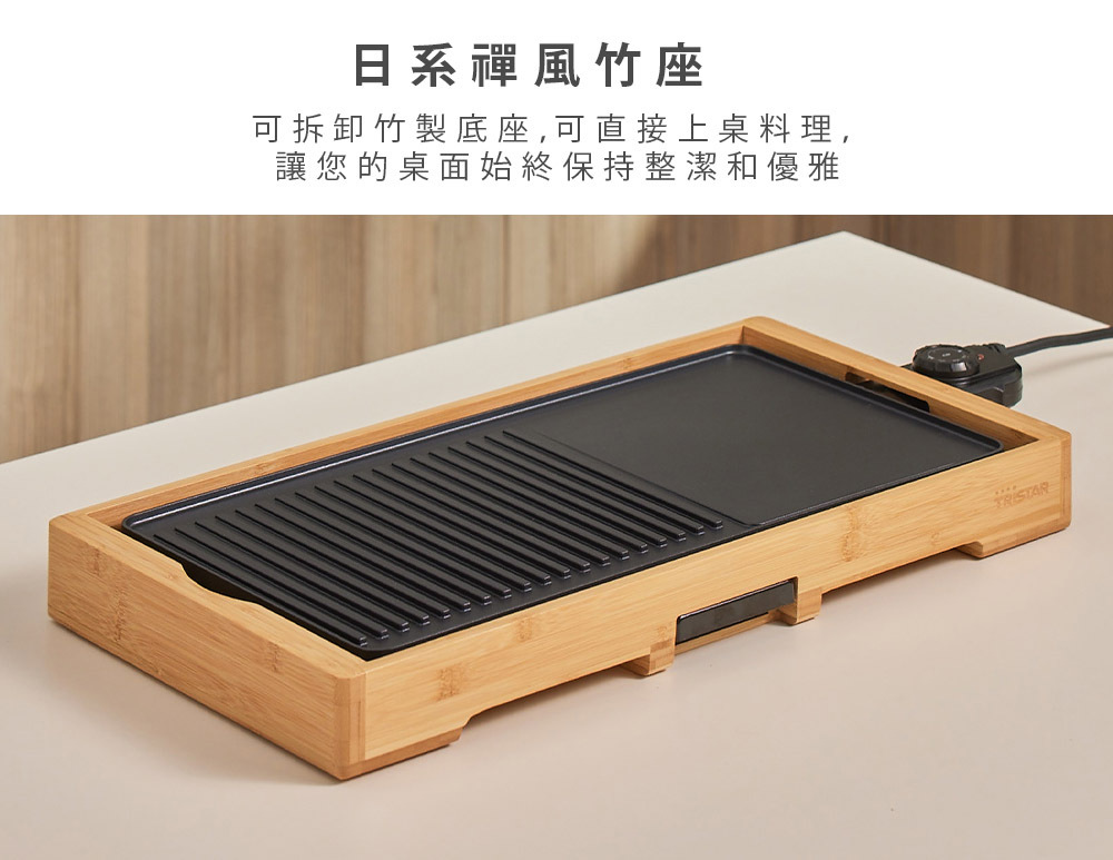 .優雅可分離竹製底座.不沾塗層輕鬆清洗.可調式溫控器.雙迴圈加熱元件.集油盤設計.過熱自動斷電保護裝置.重量:3.51kg.設計:荷蘭.產地:中國.保固:主機保固1年(不含配件).BSMI:R3A130