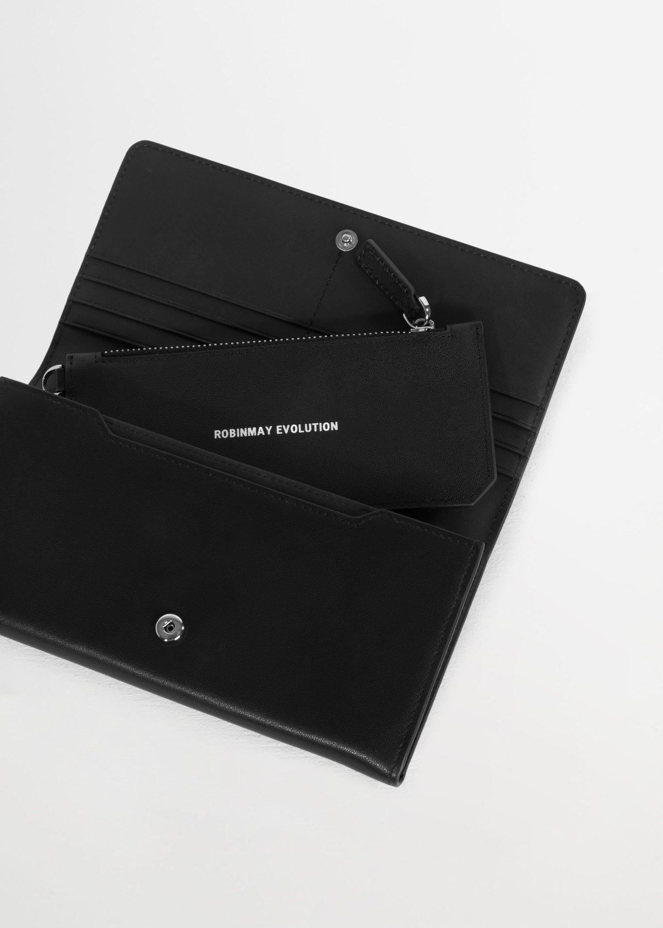 壓扣封口設計ROBINMAY EVOLUTION 鋼印標誌專為商務型男士打造豐富隔層設計,票卡輕鬆裝內附獨立零錢卡夾包【16cm*7cm】、卡夾x6