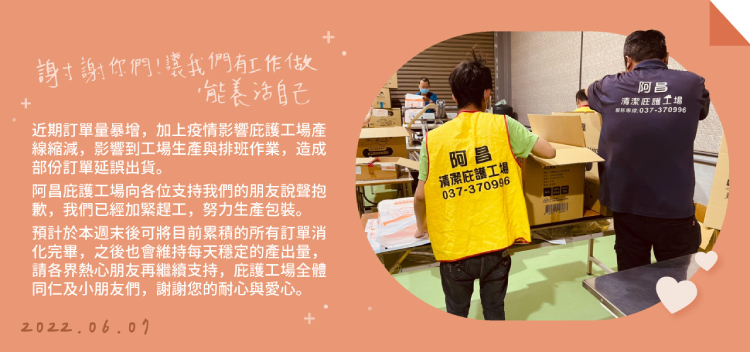 庇護工場小朋友們作業速度較慢,產量有限,可能會有供給不及的情況。當您下訂後,請稍微耐心等候,我們一定會依序將商品送至您的手中。目前貨量較大可能須5-7天才能夠出貨,再請見諒~